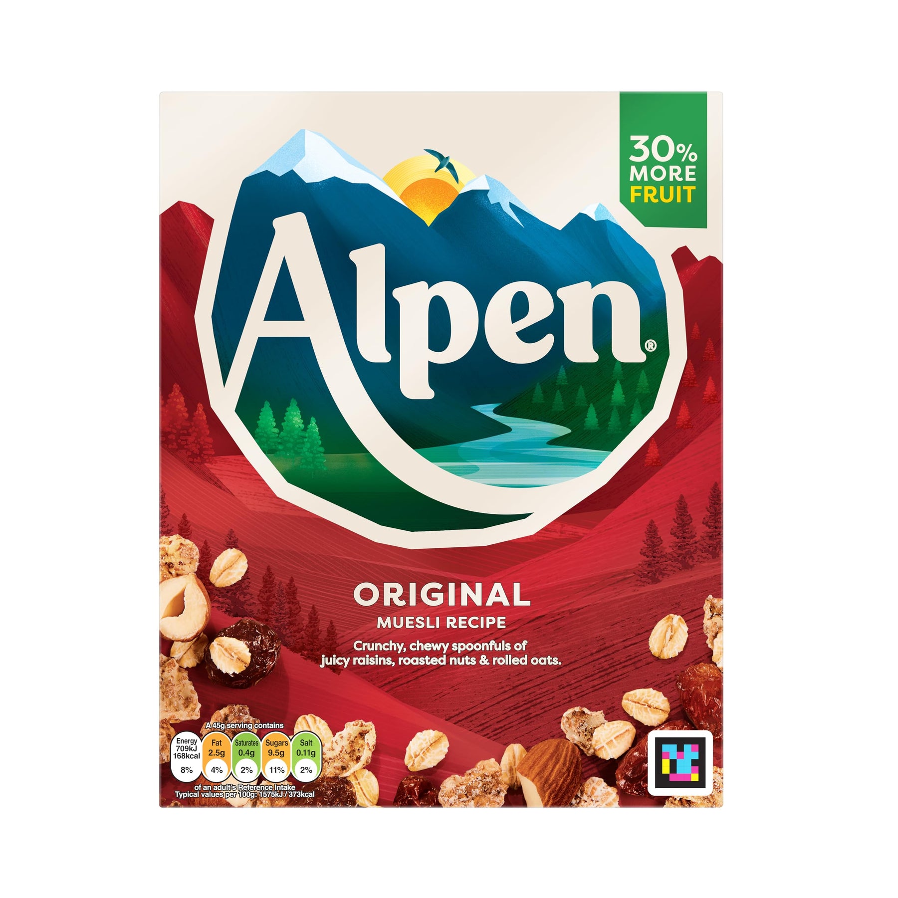 Start your day the wholesome way with Alpen Original Muesli, the UK's favourite muesli since 1978. Crafted with a delicious blend of toasted wholegrain wheat flakes, creamy rolled oats, juicy raisins, and crunchy roasted almonds and hazelnuts, this high-fibre breakfast delivers a satisfying mix of taste and nutrition. Made with 100% natural ingredients and no artificial colours, flavours, or sweeteners, it's a healthier choice without compromising on flavour. Now with 30% more fruit for an even juicier taste experience.