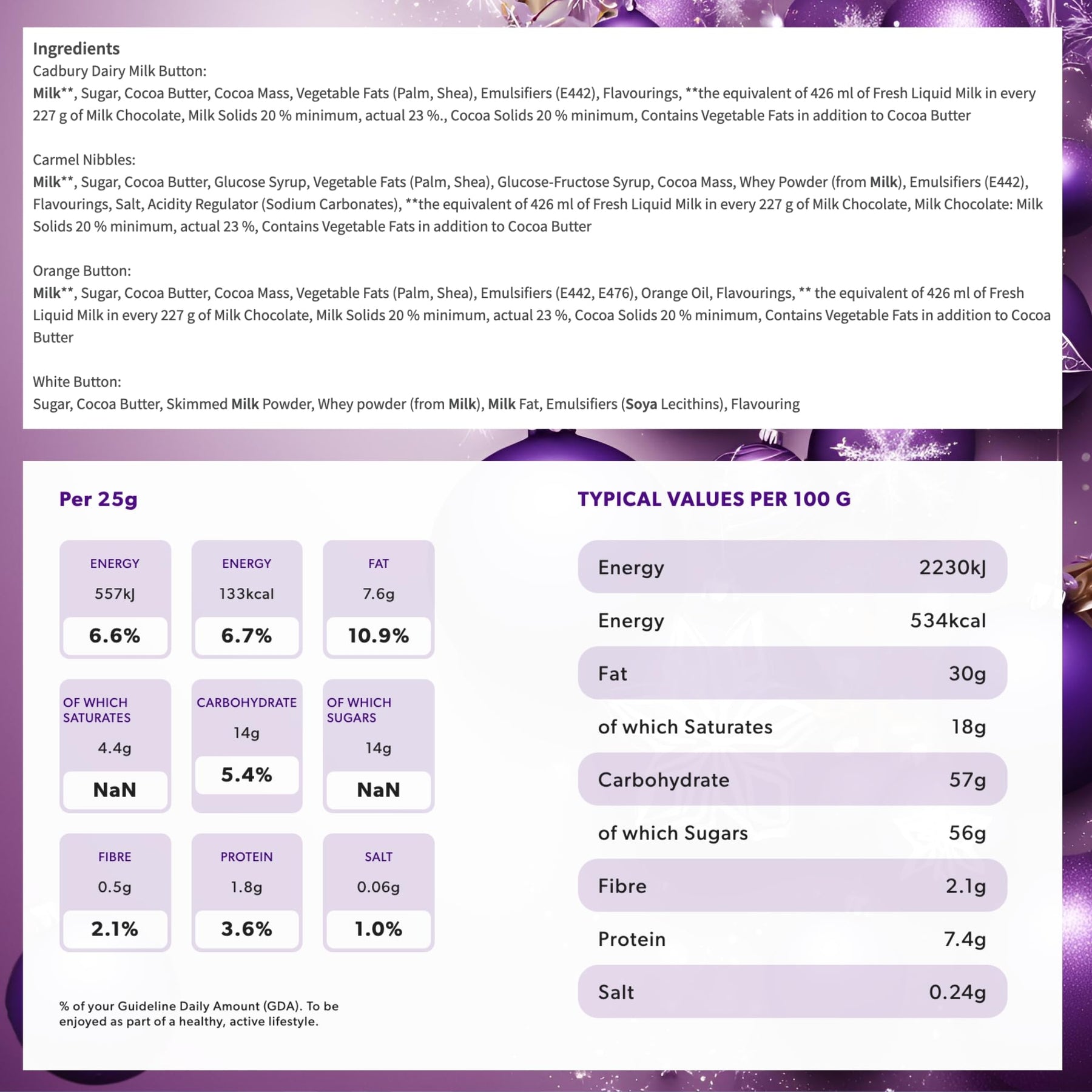 • Festive chocolate assortment featuring Cadbury Milk, Orange, and Caramel Buttons