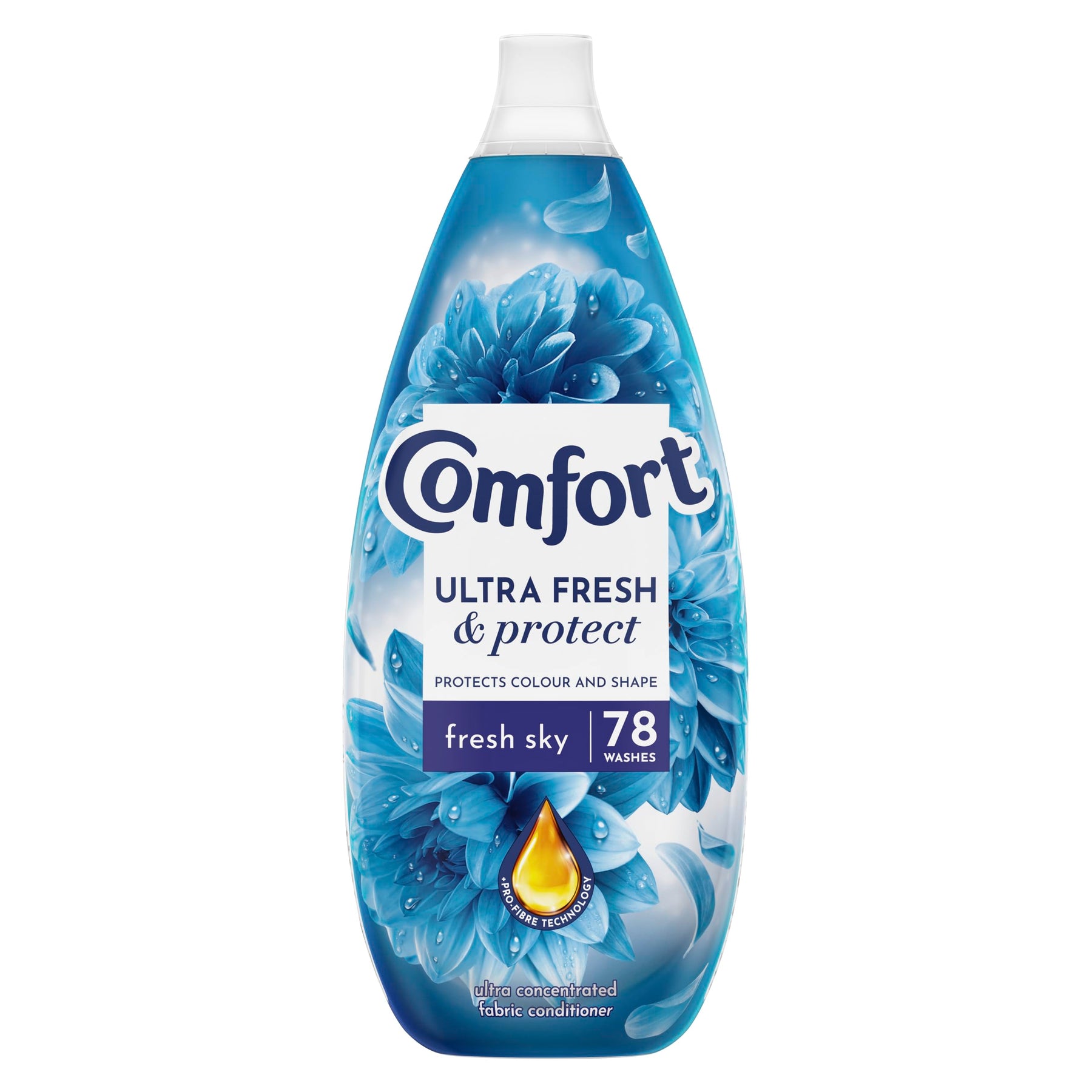 Indulge in a multisensory laundry experience with Comfort Ultra Fresh & Protect Fresh Sky Fabric Conditioner, delivering ultimate care and long-lasting freshness for your clothes. This ultra-concentrated formula is powered by Comfort’s revolutionary pro-fibre technology, which coats each fibre to strengthen fabrics, lock in colours, and help garments retain their shape from the first wash.*