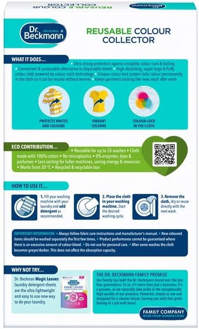 Protect your coloured laundry with the Dr. Beckmann Re-usable Colour Collector Cloth, a sustainable solution designed to absorb loose dye and dirt during washing. Ideal for mixed loads, this cloth helps prevent colour transfer, keeping your clothes vibrant and fresh wash after wash.