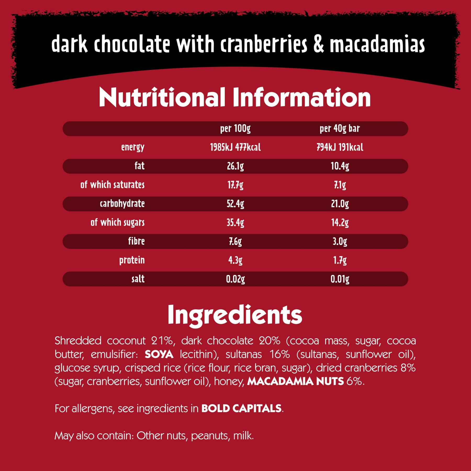- Ingredients: Shredded coconut 21%, dark chocolate 20% (cocoa mass, sugar, cocoa butter, emulsifier: SOYA lecithin), sultanas 16%, glucose syrup, crisped rice, dried cranberries 8%, honey, macadamia nuts 6%