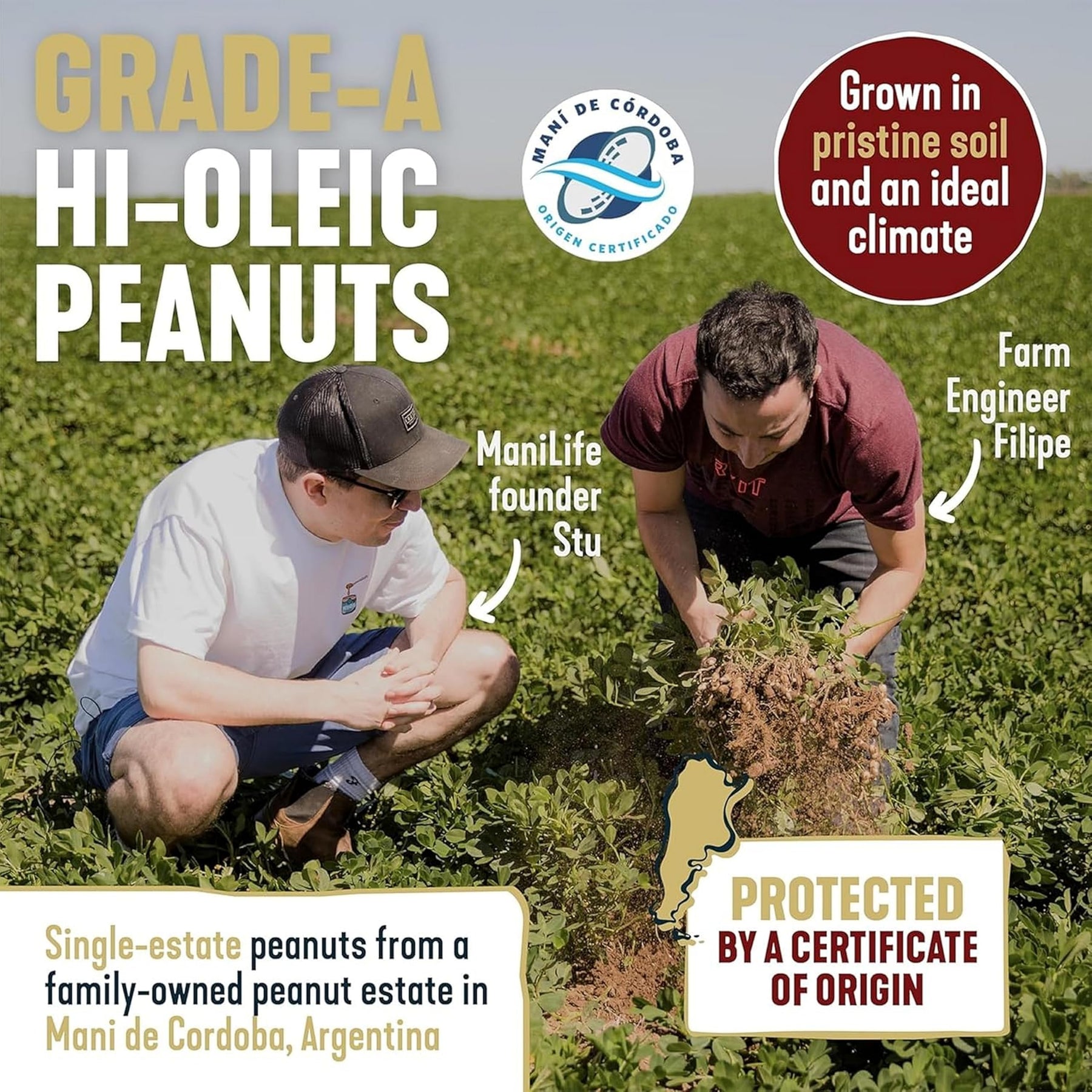 Experience the bold and intense flavor of ManiLife Deep Roast Crunchy Peanut Butter, crafted from a happy accident that led to a truly unique taste. Made exclusively with single-origin, Grade-A sweet Hi-oleic peanuts from Maní de Córdoba, Argentina, this peanut butter delivers a rich, deep roast flavor with a satisfying crunch in every spoonful. Protected by a certificate of origin, these premium peanuts ensure unmatched quality and authenticity.