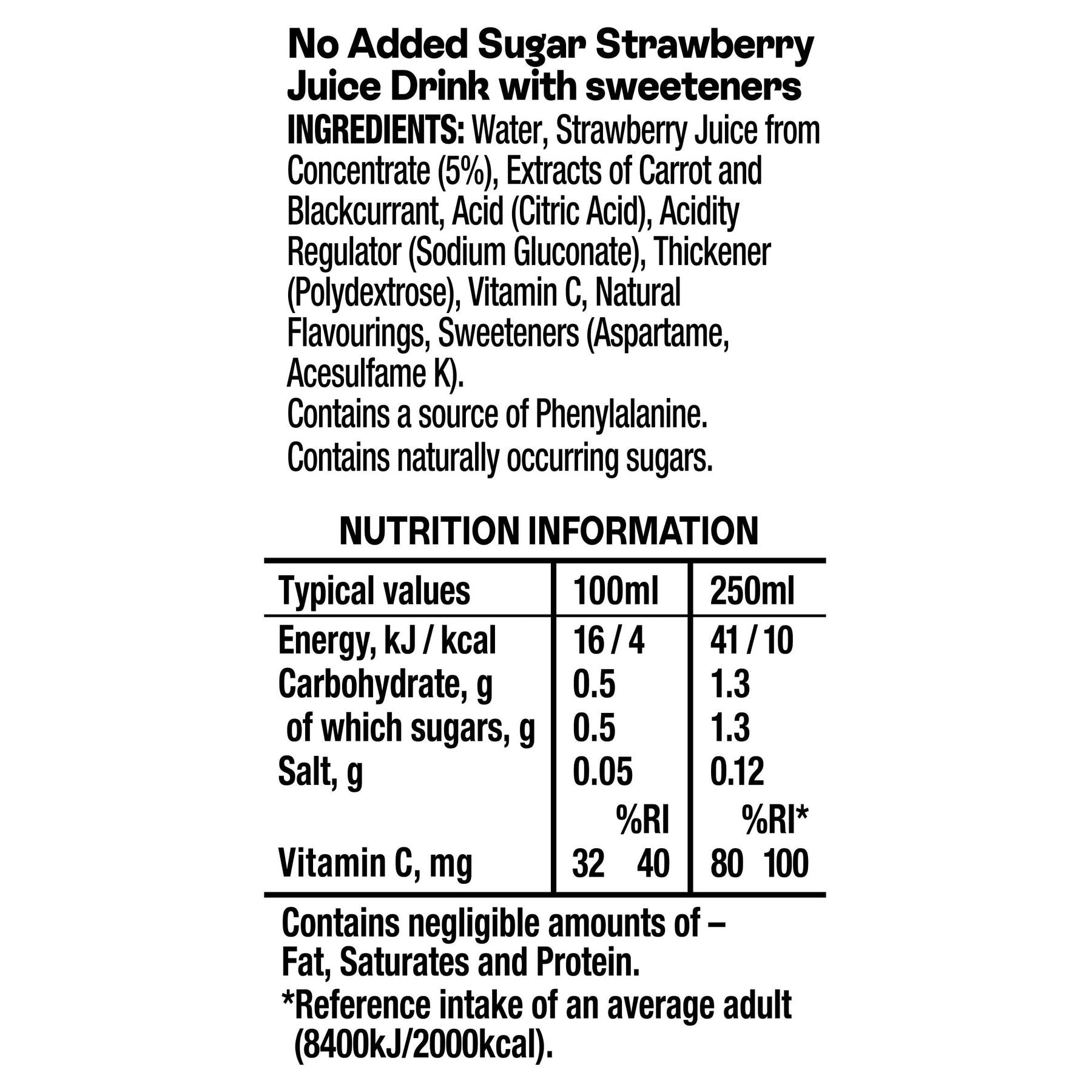- Ingredients: Water, Strawberry Juice from Concentrate (5%), Extracts of Carrot and Blackcurrant, Acid (Citric Acid), Acidity Regulator (Sodium Gluconate), Thickener (Polydextrose), Vitamin C, Natural Flavourings, Sweeteners (Aspartame, Acesulfame K)