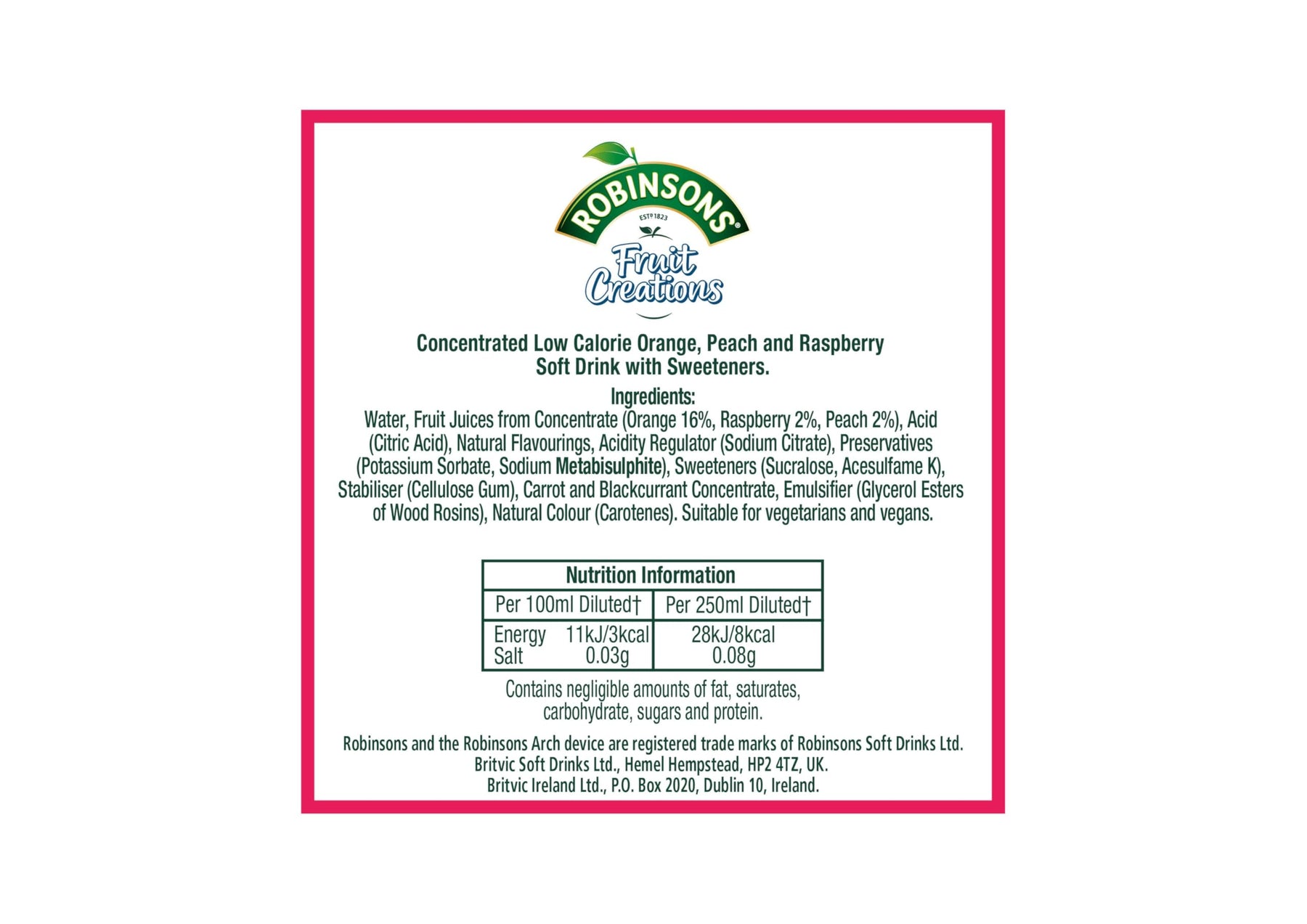 Ingredients include fruit juices from concentrate (orange 16%, raspberry 2%, peach 2%), natural flavourings, and sweeteners (sucralose, acesulfame K). Store in a cool, dry place and refrigerate after opening. Made by Britvic Soft Drinks Ltd, Hemel Hempstead, HP2 4TZ, UK.