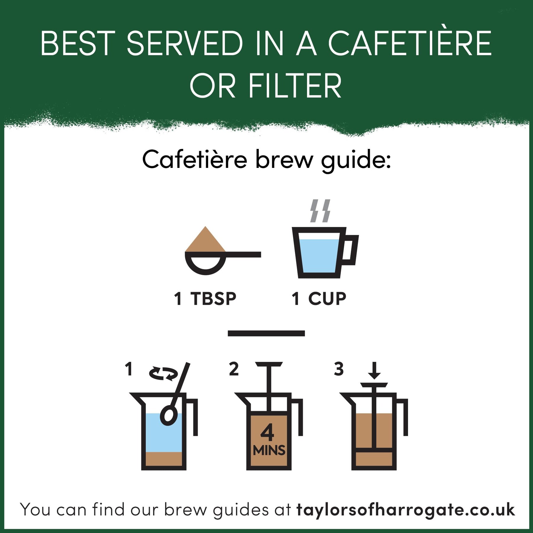 As an independent family-owned company from Harrogate, Yorkshire, Taylors is committed to quality, fairness, and sustainability. All coffee is sourced from independently certified farms and cooperatives, with this blend proudly certified by the Rainforest Alliance to support environmentally responsible farming and fair livelihoods.