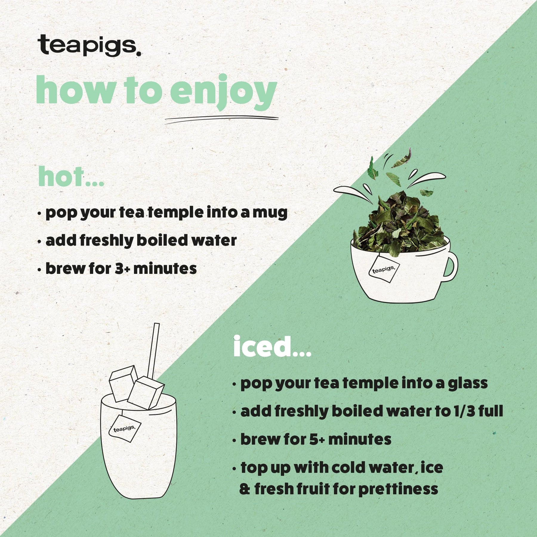 • Brewing instructions: Place one tea temple in your mug, pour over freshly boiled water (cooled for 1 minute), steep for 3–5 minutes, add milk if desired