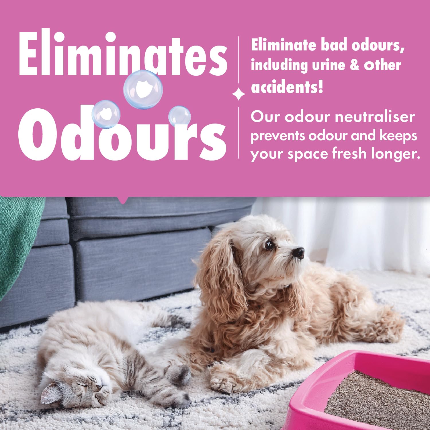 • Eliminates pet odours including urine, vomit, and faeces at the source