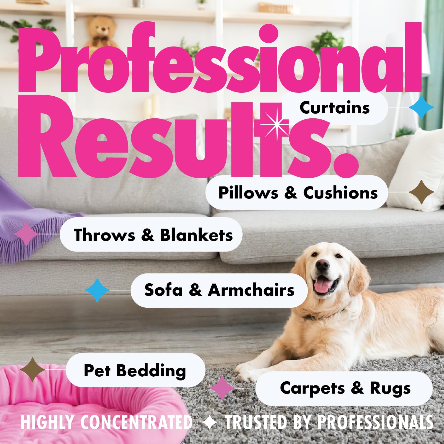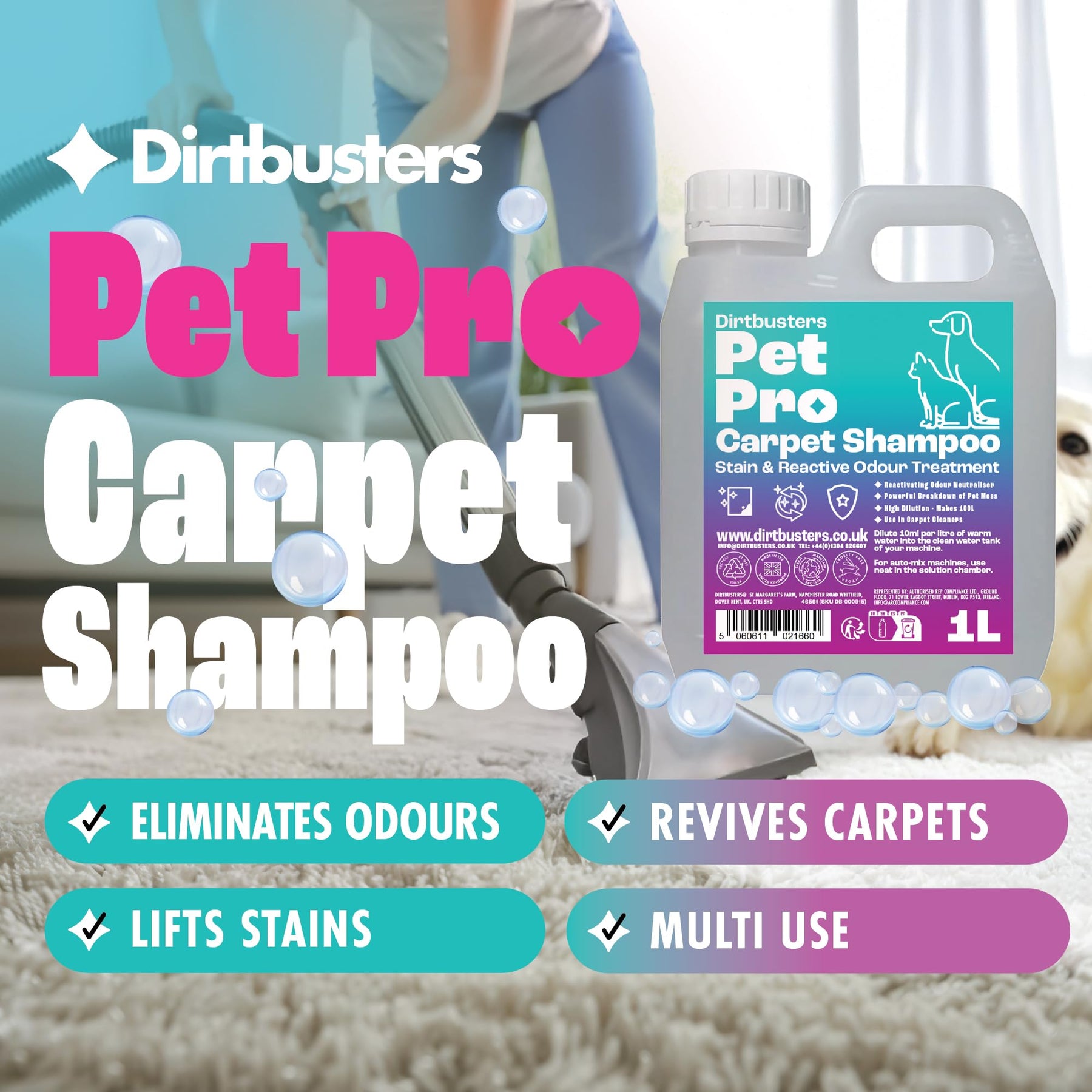 Dirtbusters Pet Pro Carpet Cleaner Shampoo is a powerful, professional-grade cleaning solution designed to tackle tough pet stains and odours. This concentrated formula effectively removes urine, faeces, vomit, paw prints, and general pet mess from carpets, rugs, upholstery, sofas, pet bedding, and various machine-cleanable fabrics. With its reactivating odour neutraliser, it eliminates odours at the source, prevents repeat markings, and leaves behind a refreshing Summer Fresh fragrance.