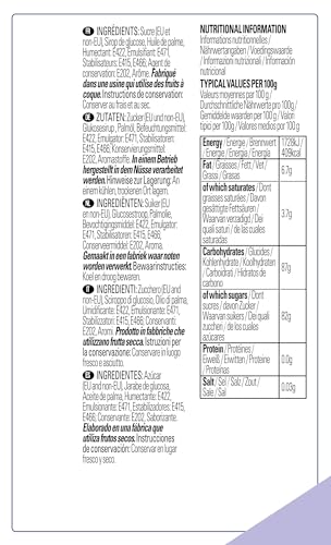 - Ingredients: Sugar (EU and non-EU), Glucose syrup, Palm oil, Humectant: E422, Emulsifier: E471, Stabilisers: E415, E466; Preservative: E202, Flavouring