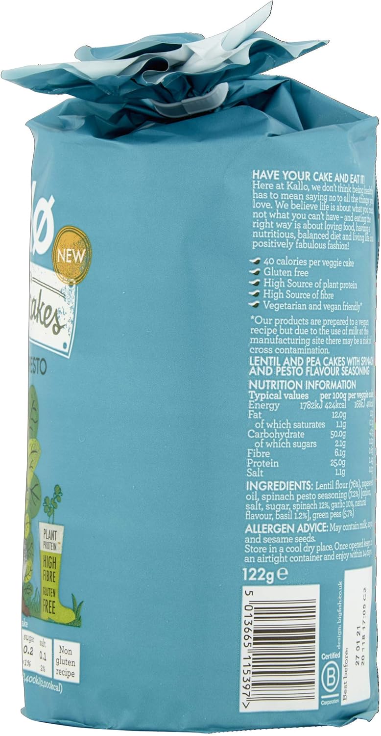 Kallo Spinach & Pesto Veggie Cakes are delicious, plant-based puffed crackers made with lentil flour and green peas, offering a gluten-free, high-protein, and high-fibre snack option. Perfect for those seeking a nutritious, vegan-friendly alternative to traditional snacks, these veggie cakes deliver bold flavour with every bite. Enjoy them plain or elevate your experience with fresh toppings like tomato slices, pesto, or crushed peas.