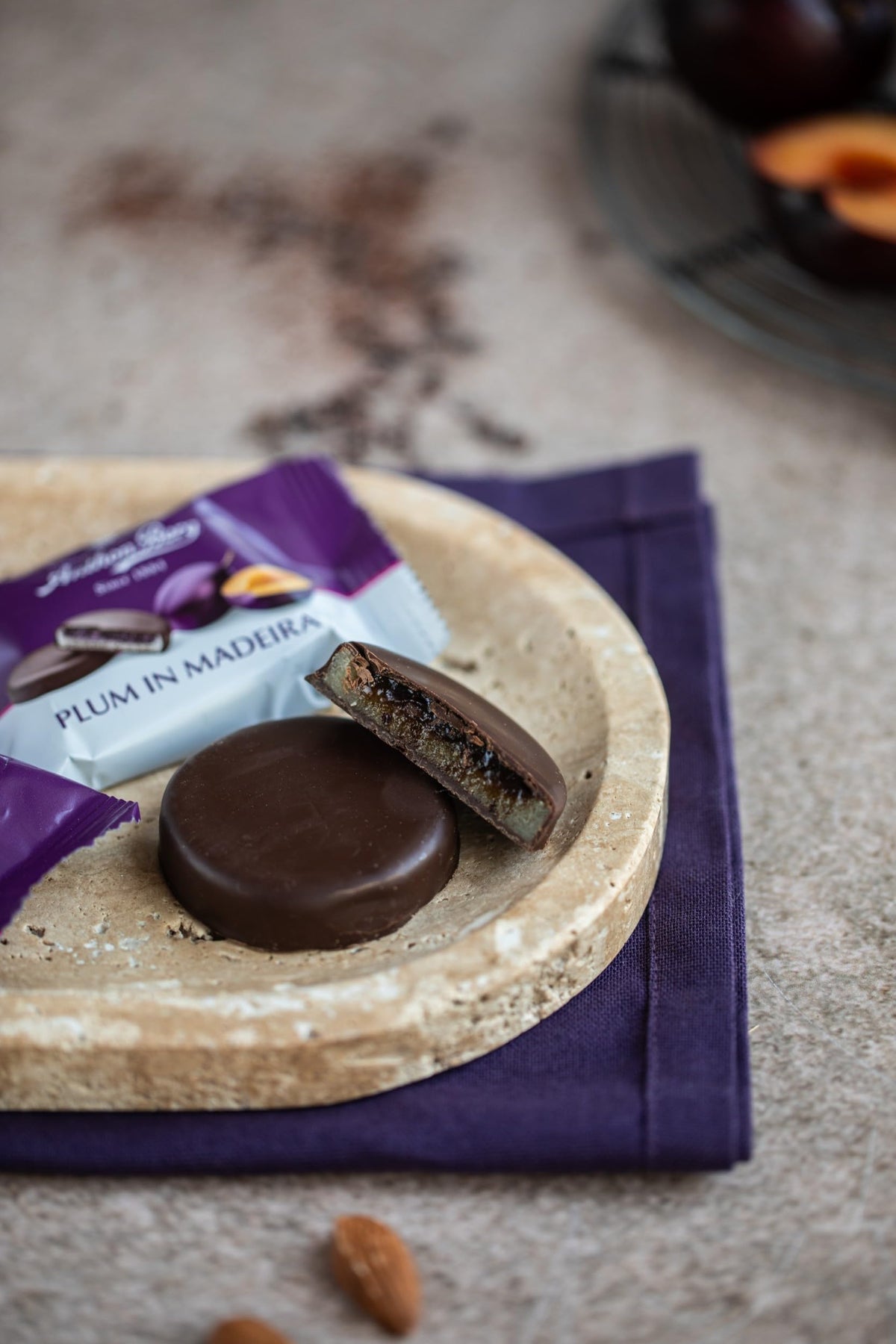 - FLAVOUR COMBINATION: Plum and fruit blend infused with 1.5% Madeira wine, encased in marzipan and smooth dark chocolate