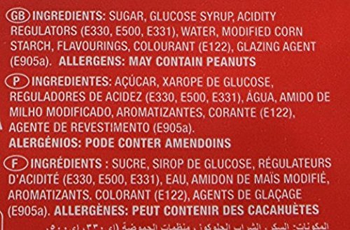 • Ingredients: SUGAR, GLUCOSE SYRUP, ACIDITY REGULATORS (E330, E500, E331), WATER, MODIFIED CORN STARCH, FLAVOURINGS, COLOURANT (E122), GLAZING AGENT (E905a)