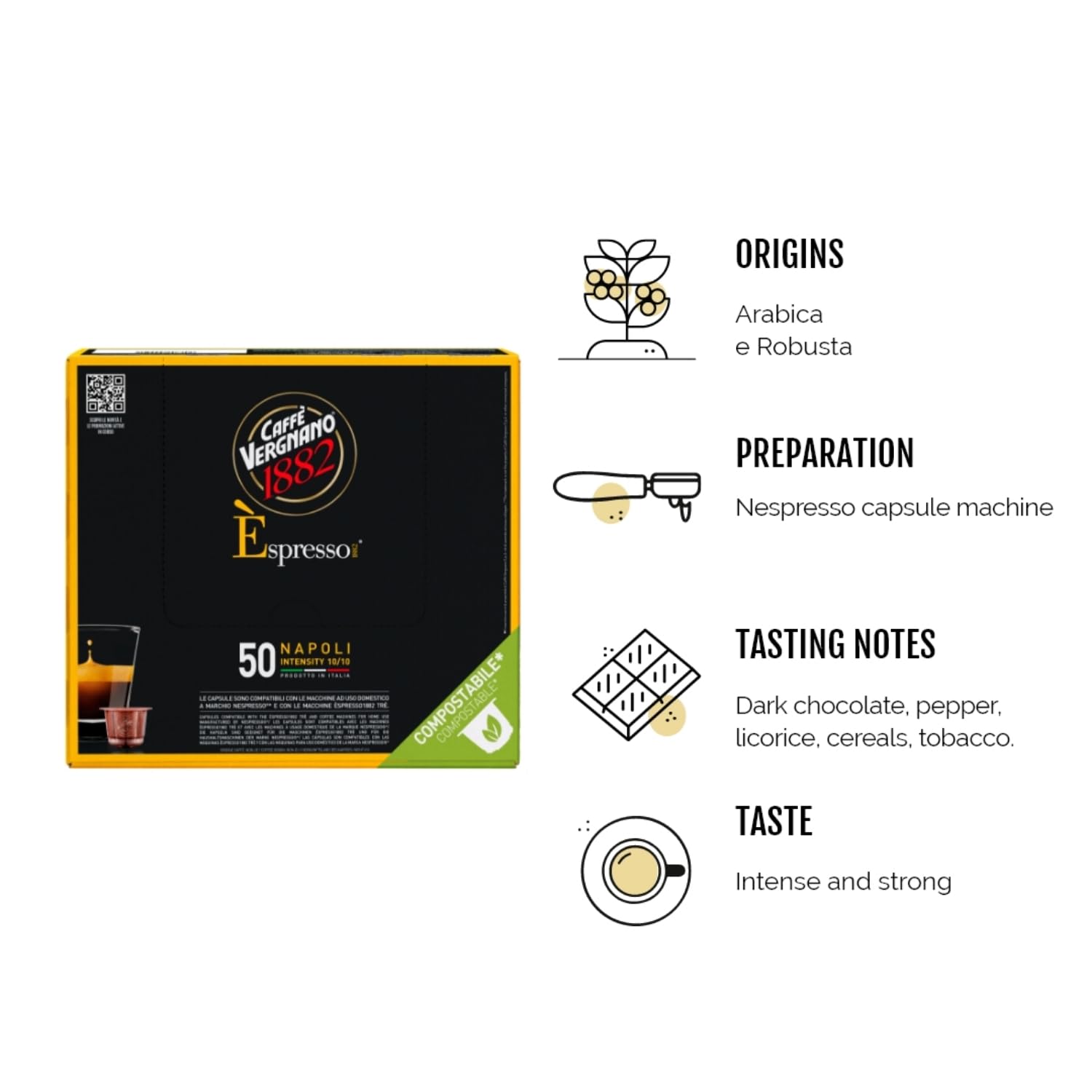 - 50 capsules compatible with Nespresso* and Èspresso1882 TRÈ by Caffè Vergnano machines