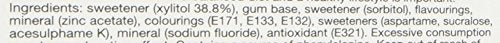 - Sorbitol, aspartame, sucralose, acesulphame K: Sweeteners that do not contribute to tooth decay