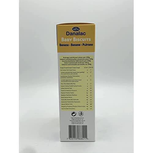 Nutritionally tailored for babies 6 months and older, Danalac Banana Baby Biscuits offer a tasty and wholesome snack option. These crispy biscuits are enriched with essential vitamins, calcium, and iron to support your baby's growth and development. Designed to dissolve easily in your baby's mouth, they're ideal for self-feeding or as a soft spoon-fed treat when soaked in milk or warm water.
