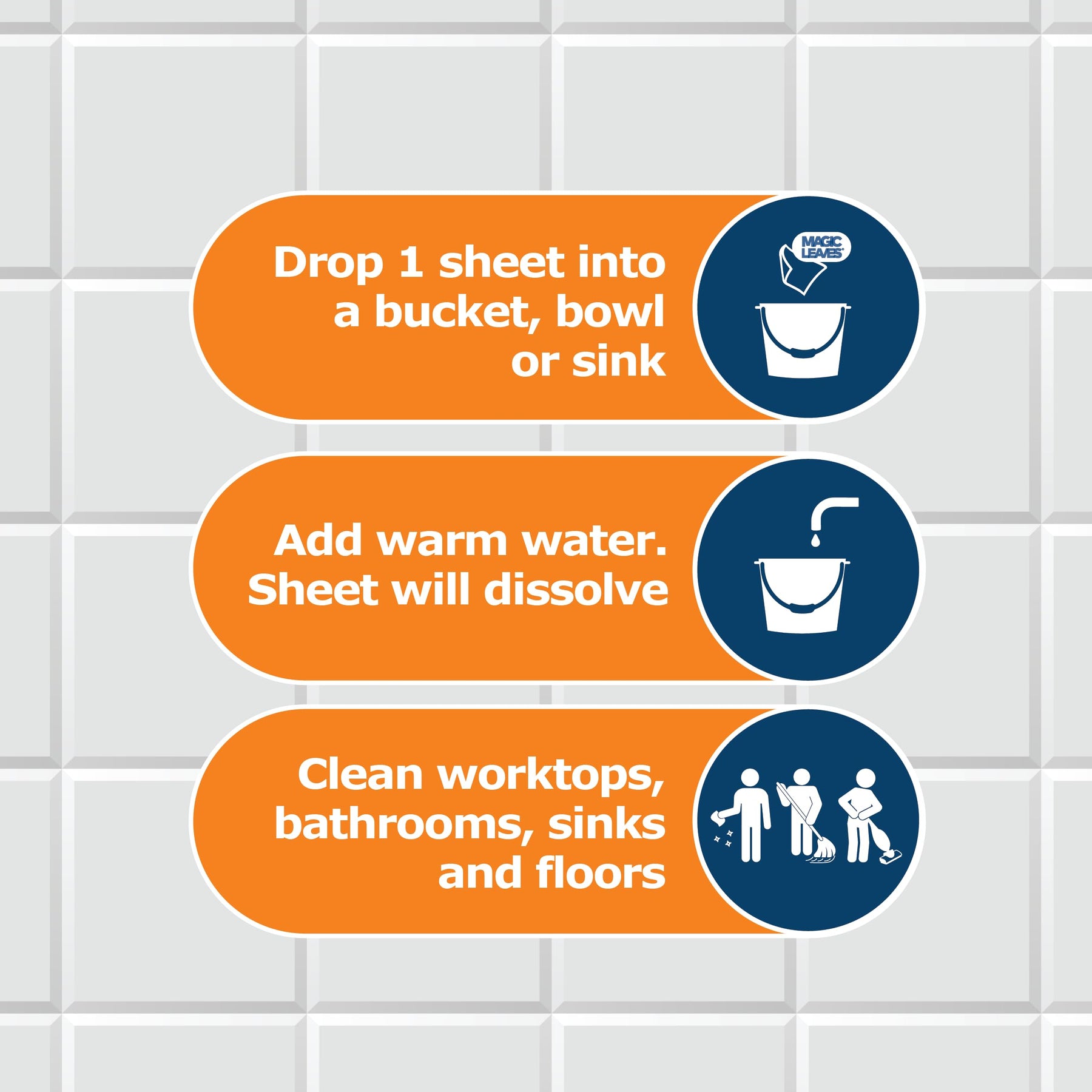 - Use 1 sheet per 5L of warm water; 2 sheets for heavy soiling