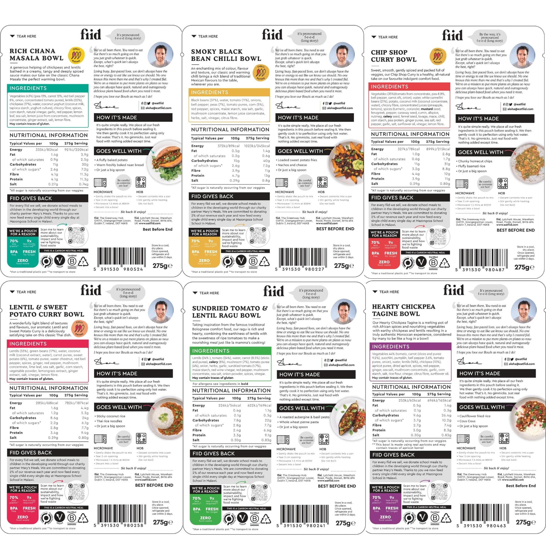 Enjoy the natural, wholesome taste of Fiid's vegan microwave meals, crafted by expert chefs and dieticians for a nutritious, plant-powered meal in just 90 seconds. This 6-flavour multipack includes Mexican Black Bean Chilli, Italian Sundried Tomato & Lentil Ragu, Moroccan Chickpea Tagine, Chip Shop Curry, Rich Chana Masala, and Aromatic Lentil & Sweet Potato Curry—each made with 100% natural ingredients, no additives or preservatives, and packed with fibre and protein.