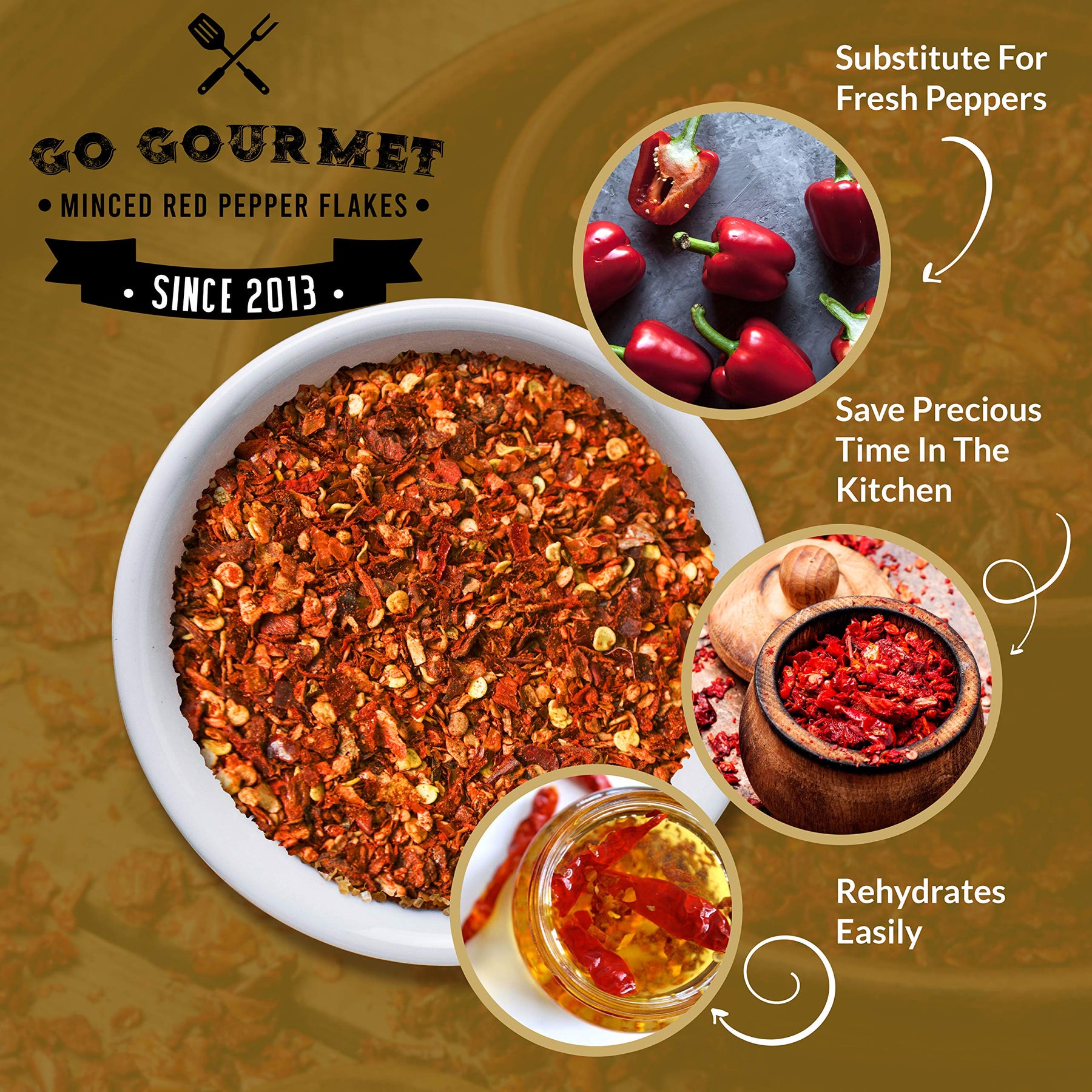 Go Gourmet's minced and dehydrated red pepper flakes offer a convenient, flavorful, and time-saving alternative to fresh red bell peppers. Perfect for busy home cooks, these dried pepper pieces rehydrate quickly and deliver a sweet, mild flavor with a meatier texture than fresh peppers. Ideal for enhancing soups, stews, casseroles, sauces, and any dish calling for diced red bell peppers.