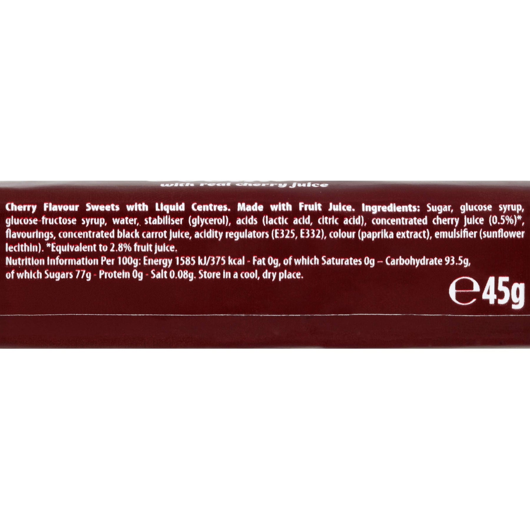 Contains sugar, glucose syrup, glucose-fructose syrup, water, stabiliser (glycerol), acids (lactic acid, citric acid), concentrated cherry juice (0.5%, equivalent to 2.8% fruit juice), flavourings, concentrated black carrot juice, acidity regulators (E325, E332), colour (paprika extract), and emulsifier (sunflower lecithin).