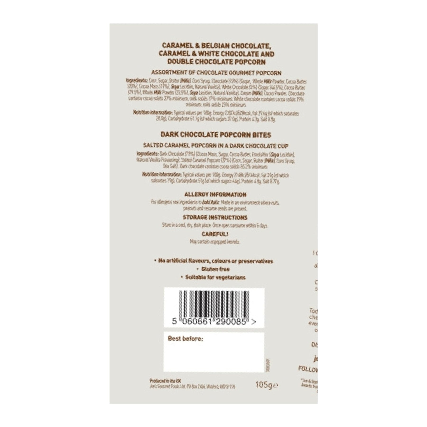 Indulge in the luxurious taste of Joe & Seph's Chocolate Lovers Popcorn Selection, a premium medley of handcrafted popcorn treats made in Great Britain. This elegant white and gold gift box contains a delicious mix of caramel & white chocolate, caramel & Belgian chocolate, double chocolate, and rich dark chocolate popcorn bites—perfect for gifting or treating yourself.