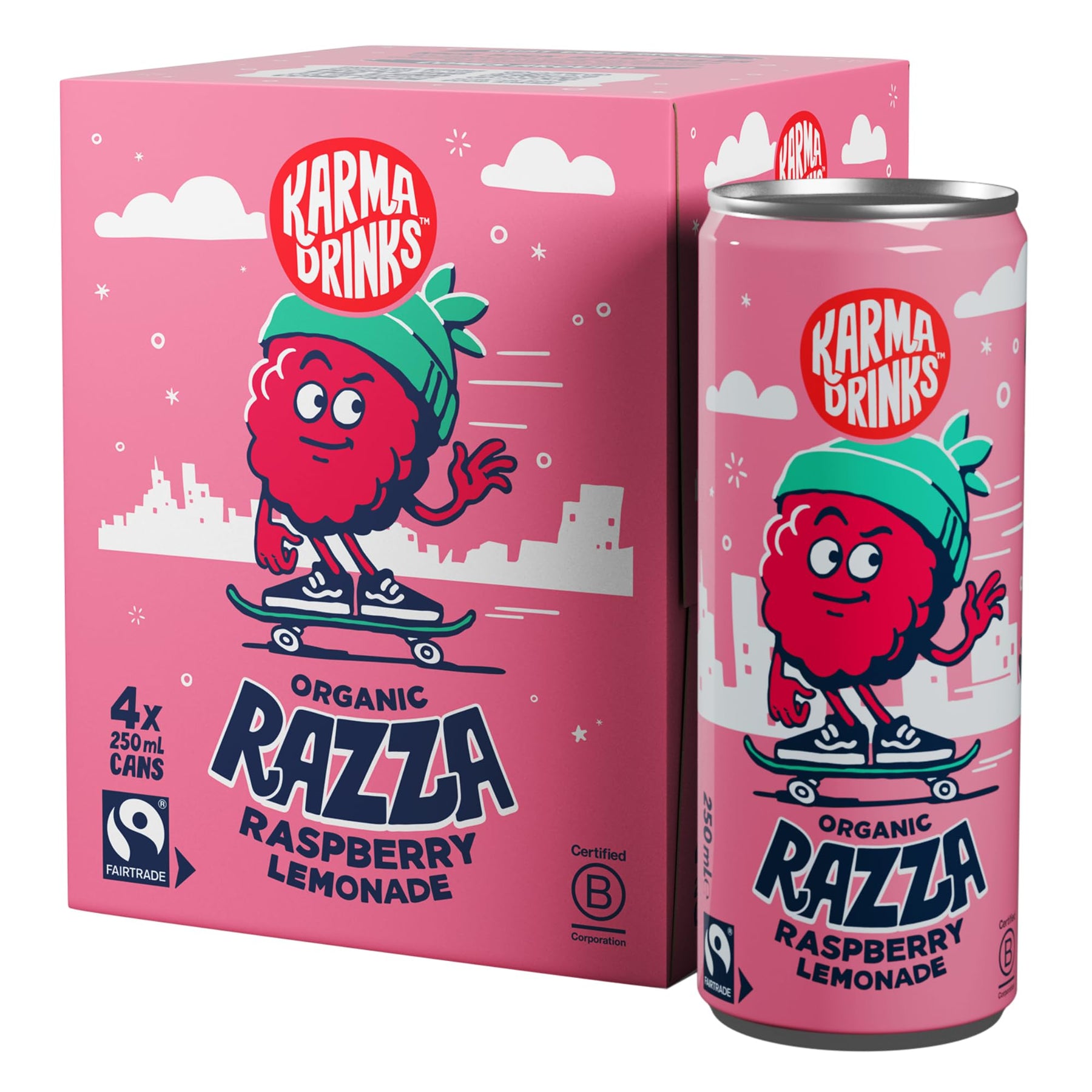 Kick back with KARMA DRINKS Razza, a vibrant pink raspberry lemonade crafted with organic lemons and Fairtrade cane sugar. This refreshing sparkling drink delivers a perfect balance of zesty lemon and sweet raspberry, all in a guilt-free formula with just 50 calories per can.