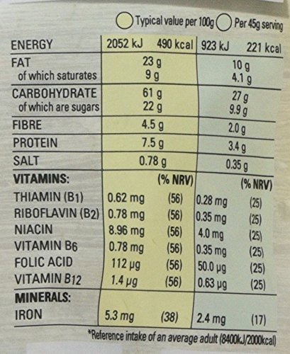 - Nutritional values based on 100g serving: Fat 24g (sat. 10g), Carbohydrate 64g (sugars 22g), Protein 7.6g, Salt 0.78g