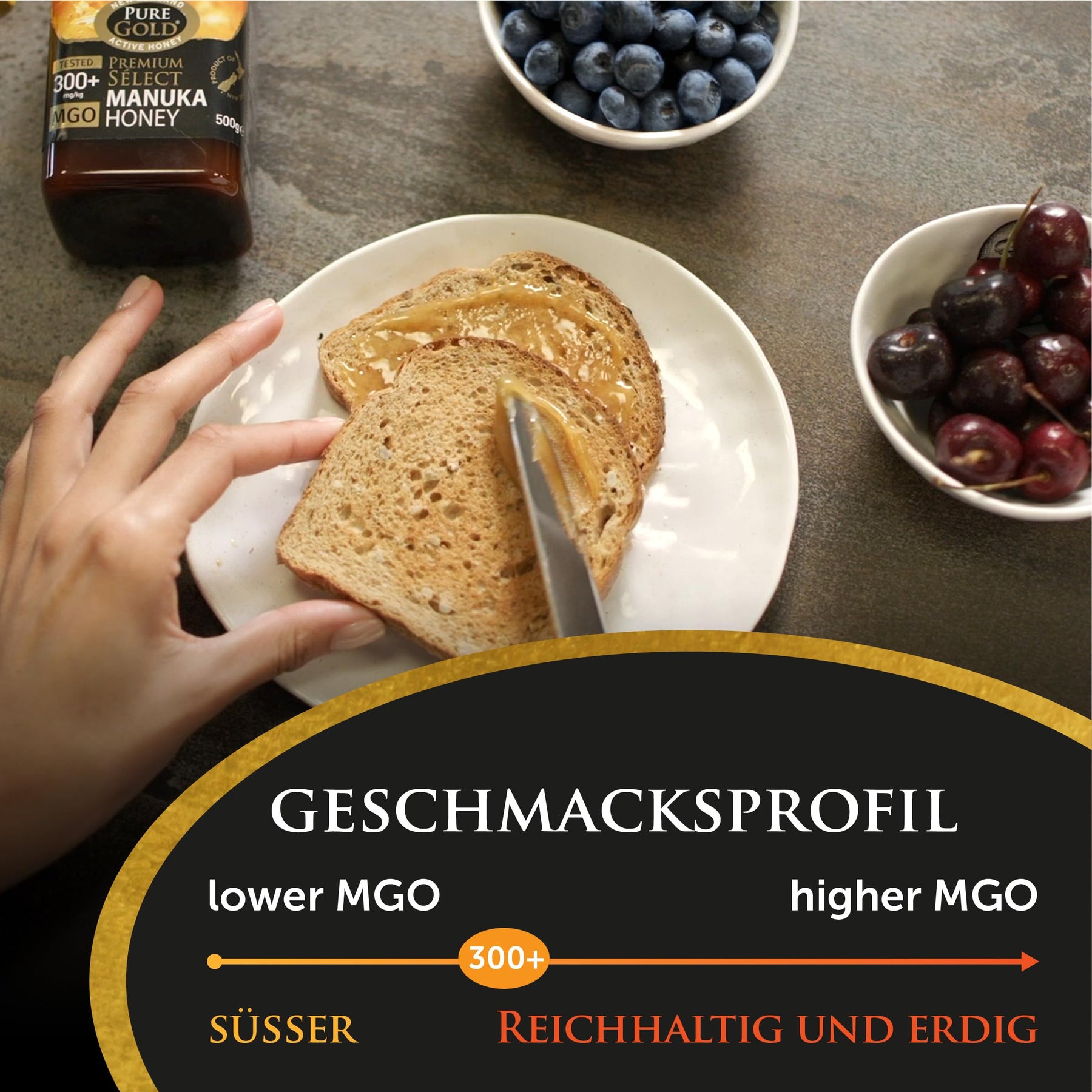 - 300+ MGO: Methylglyoxal is the compound responsible for Manuka Honey’s distinctive activity. A rating of 300+ MGO indicates high strength and purity, supporting general wellness, digestion, immunity, and natural energy.