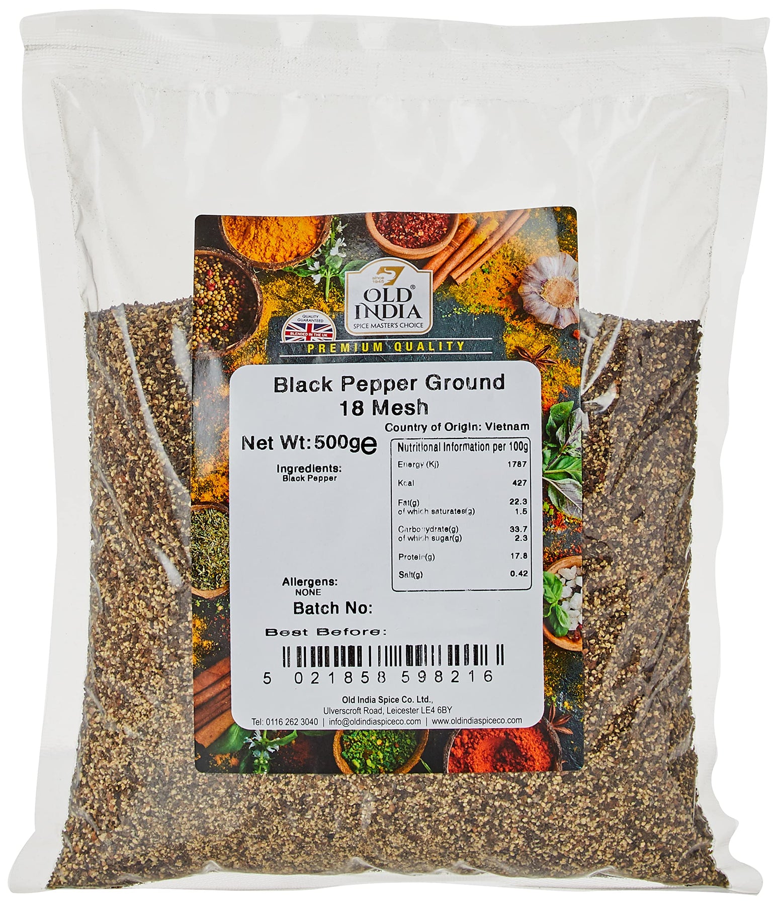 Old India Black Pepper Ground 18 Mesh is a premium, 100% natural spice sourced from Vietnam and packed in a vegetarian atmosphere to ensure purity. This finely ground black pepper is additive-free and GMO-free, sealed in a heat-sealed bag to preserve freshness for up to two years. Ideal for enhancing curries, vegetable dishes, sauces, soups, stews, and a wide range of culinary creations.