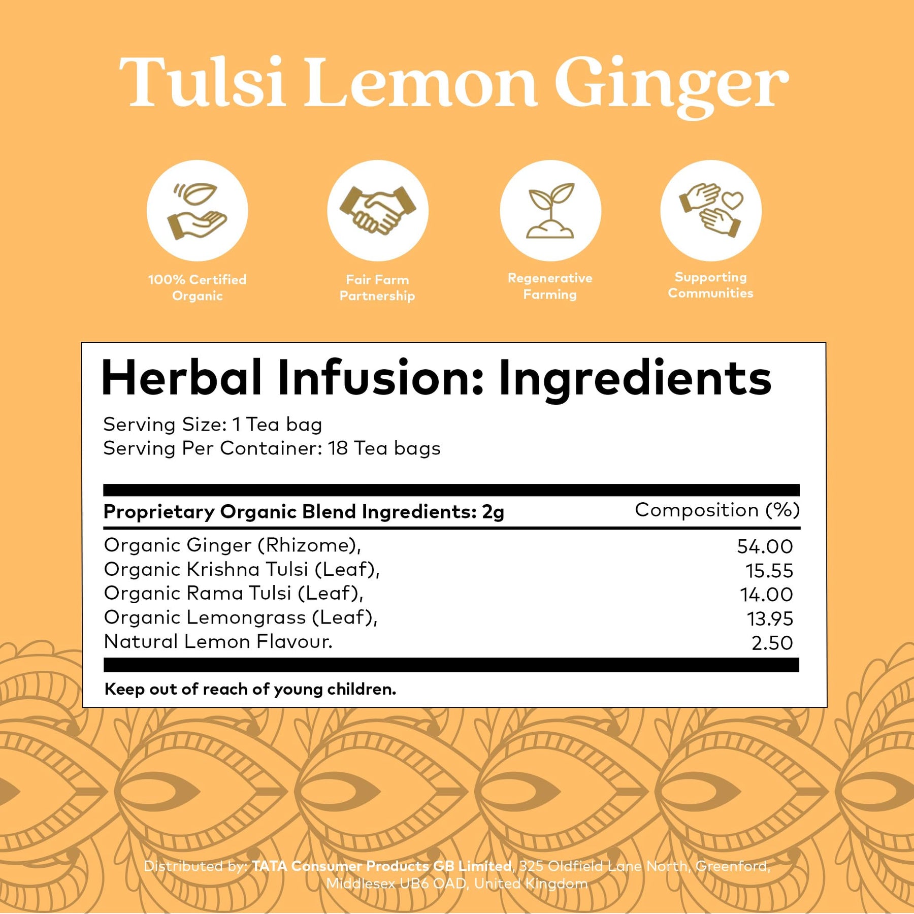 Reignite your senses and support digestion with this invigorating Ayurvedic herbal tea blend. Organic India Tulsi Lemon & Ginger Tea combines the warming spice of organic ginger rhizome with the refreshing zest of lemongrass and natural lemon flavour, rounded out by the soothing properties of Krishna and Rama Tulsi leaves. This naturally caffeine-free infusion delivers a bright, warming experience perfect for any time of day—morning pick-me-up or soothing after-meal ritual.