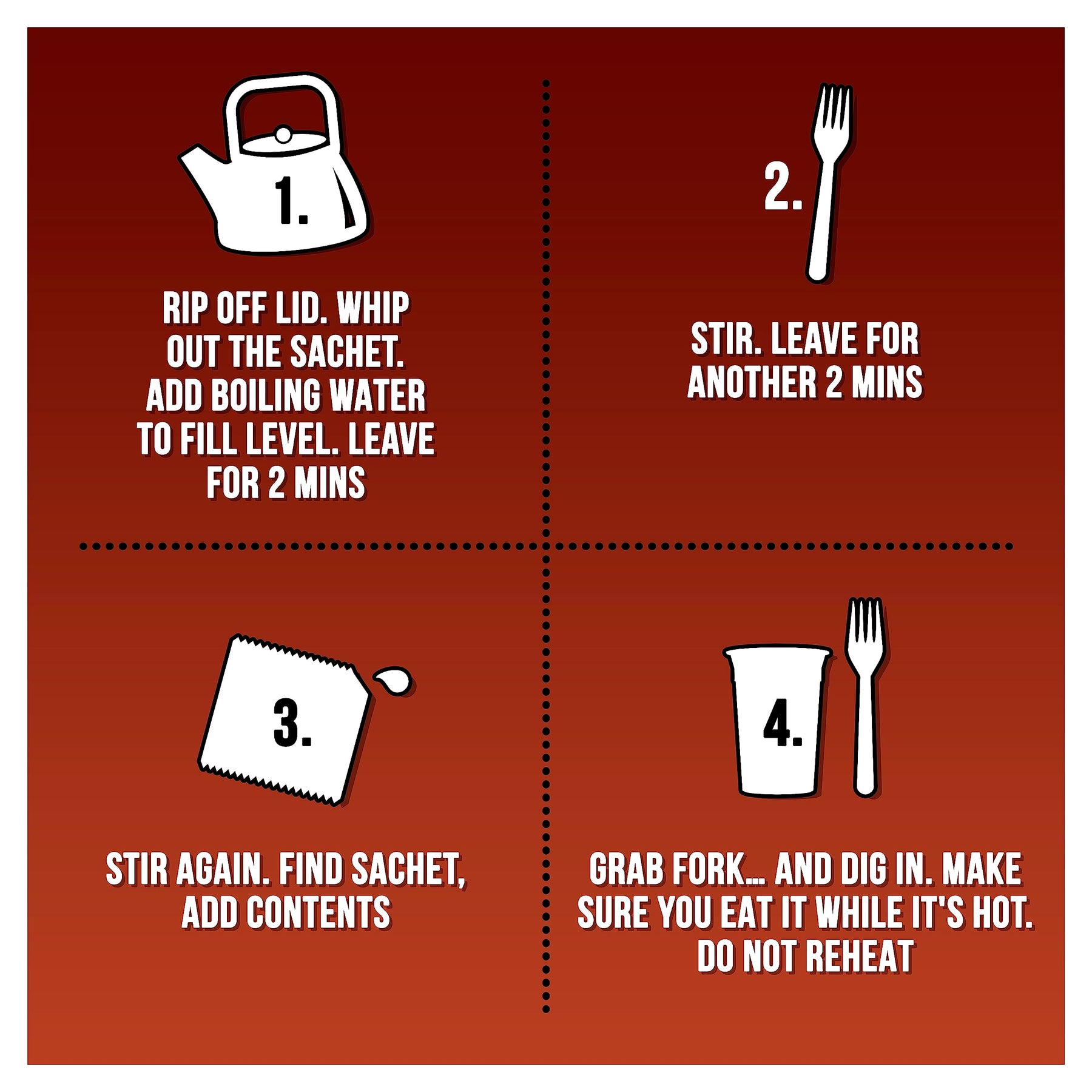 • Preparation: Add boiling water to fill level, cover, wait 2 minutes, stir, wait 2 more minutes, stir again with sachet contents, and enjoy