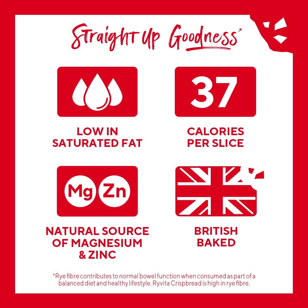 Ryvita Original Rye Crispbread is a wholesome and satisfying snack made with deliciously healthy wholegrain rye. Its simple recipe of wholegrain rye flour, rye flour, and salt creates a satisfyingly crunchy texture that suits a variety of tastes. Perfectly versatile, it can be enjoyed with sweet or savory toppings any time of day.