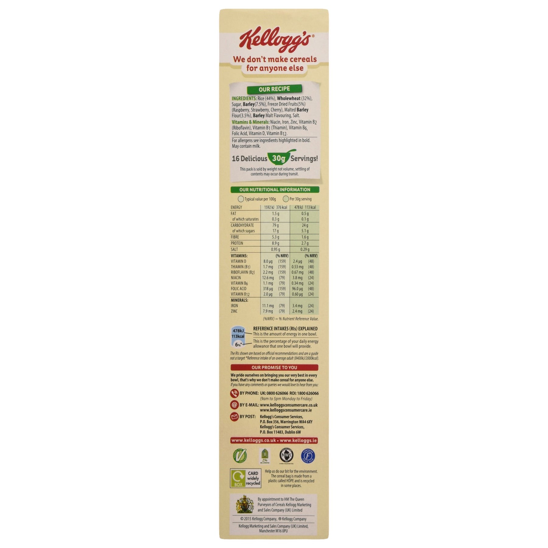 • Ingredients: Rice (43%), WHOLEWHEAT (31%), Sugar, BARLEY (7.5%), Malted BARLEY Flour, Freeze Dried Fruits (5%) (Raspberry, Strawberry, Cherry), BARLEY Malt Flavouring, Salt, Vitamins & Minerals