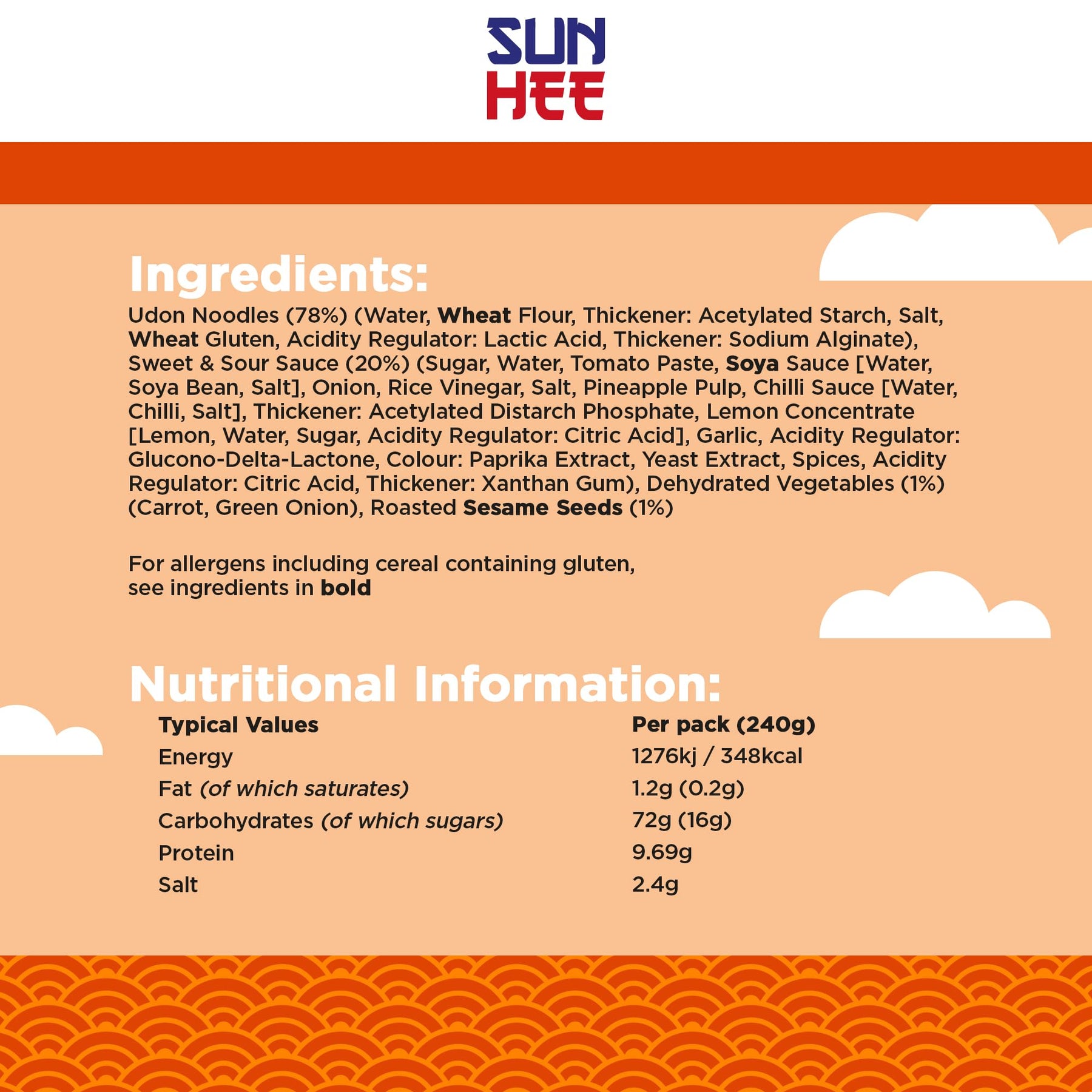 Enjoy a quick and satisfying meal with the Sun Hee Sweet and Sour Udon Bowl. This ready-to-eat noodle bowl features authentic Asian flavors with a tangy sweet and sour profile and a spicy kick, delivering a traditional taste in minutes. Perfect for busy days or on-the-go moments, the microwaveable bowl makes preparation effortless—just heat for 1-2 minutes and enjoy.