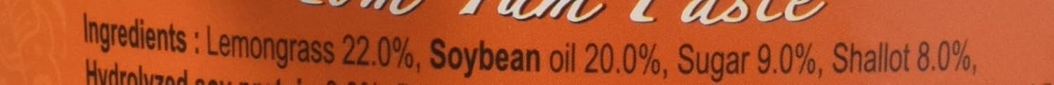 - Lemongrass 22%, SOYBEAN oil 20%, sugar 9%, shallot 8%, HVP (hydrolyzed SOY protein) 6%, dried red chilli 5%, garlic 5%, galangal 5%, salt 3%, citric acid (E330) 2.5%, SHRIMP paste (SHRIMP (CRUSTACEAN)) 80%, salt 20%) 2%, tamarind 2%, FISH sauce (ANCHOVY 70%) 2%, monosodium glutamate (E621) 2%, dried SHRIMP (CRUSTACEAN) 1%, kaffir lime peel 0.5%