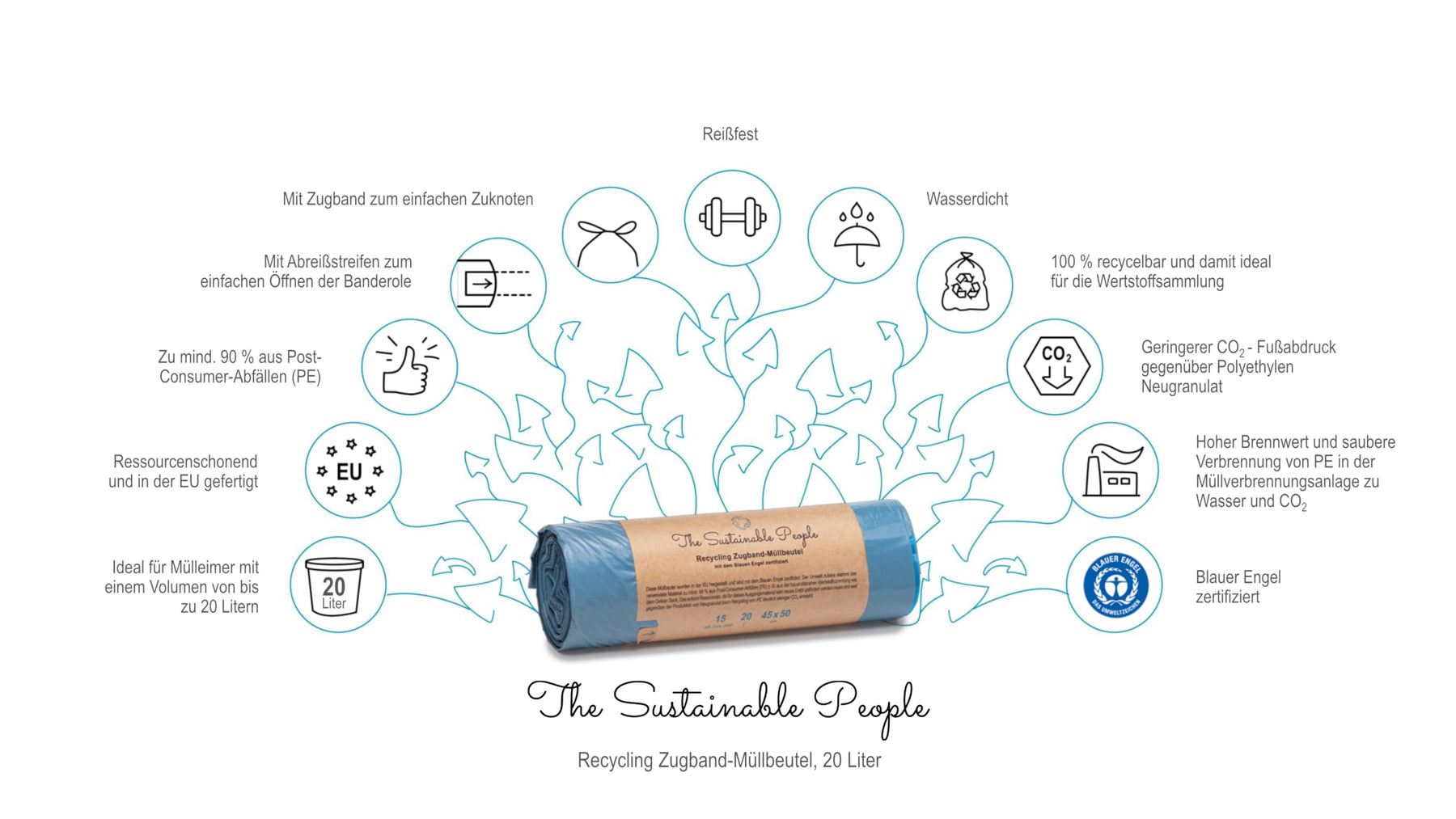 These eco-friendly bin liners are certified with the Blue Angel (UZ 30a), confirming they are made from recycled materials, limit harmful substances, and support sustainable production. The material, sourced from household recycling such as the yellow bag, significantly reduces CO₂ emissions compared to new PE granules.