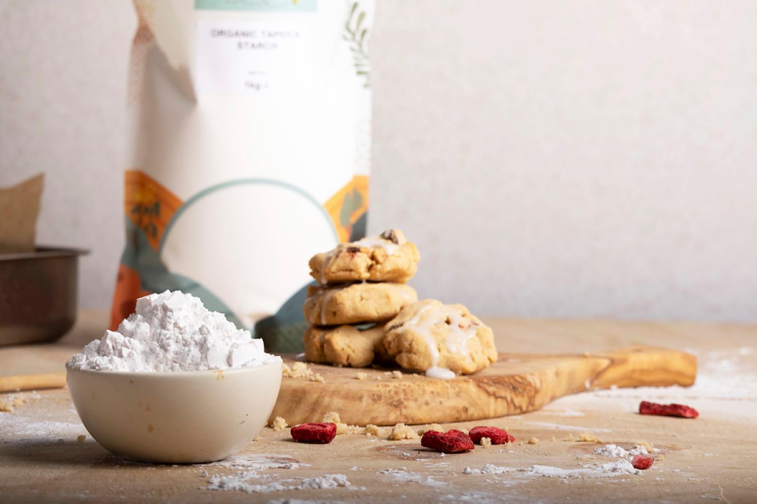 Tapioca starch, extracted from cassava root, is a versatile and natural ingredient used in baking and cooking. It works exceptionally well as a thickener in desserts, soups, fruit pies, and sauces, while also enhancing texture in breads and sponges. Ideal for gluten-free diets, it can replace maize or corn flour and blends seamlessly with other flours without altering flavor profiles. Adds crispiness to crusts and chewiness to baked goods, making it perfect for flatbreads, muffins, and springy loaves.