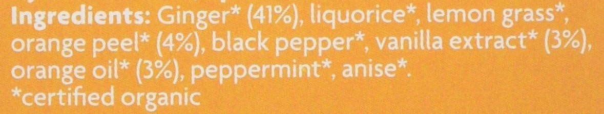 - Organic herbal tea blend with 41% ginger, 4% orange peel, 3% vanilla extract, and 3% orange oil