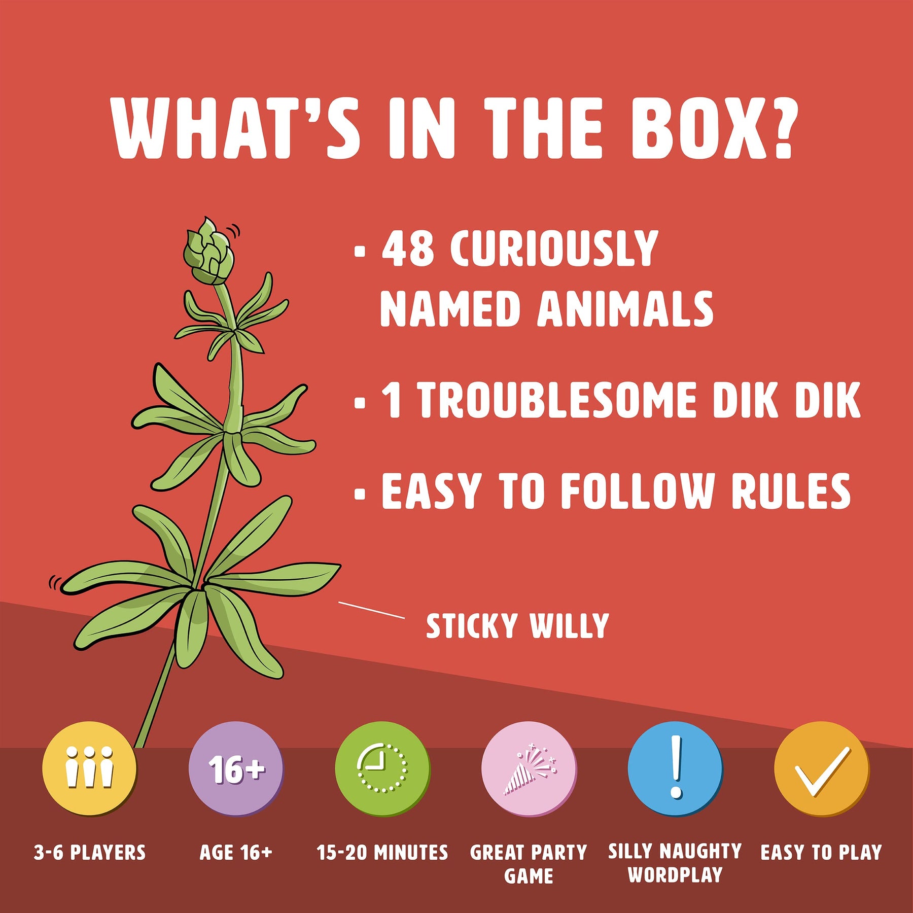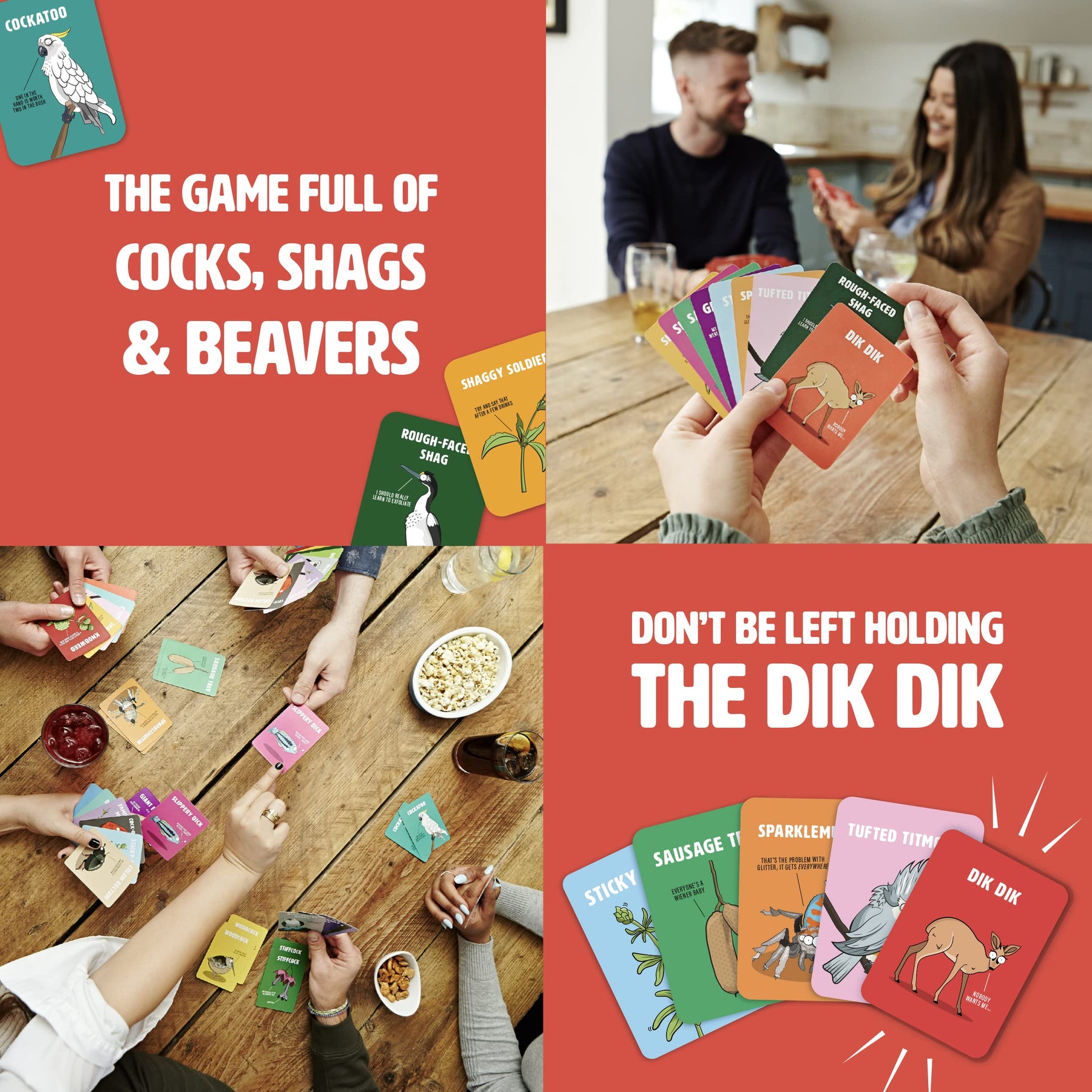 Get ready to giggle with Don't Be A Dik Dik, the hilariously cheeky card game from Ginger Fox that celebrates nature's naughtiest names. Perfect for adults who love a laugh, this game brings the fun with outrageous animal and plant names like Giant Beaver, Nipplewort, and Tufted Titmouse. Designed for 3 to 6 players aged 16 and up, it's a must-have for parties, holidays, or game nights with friends and family.