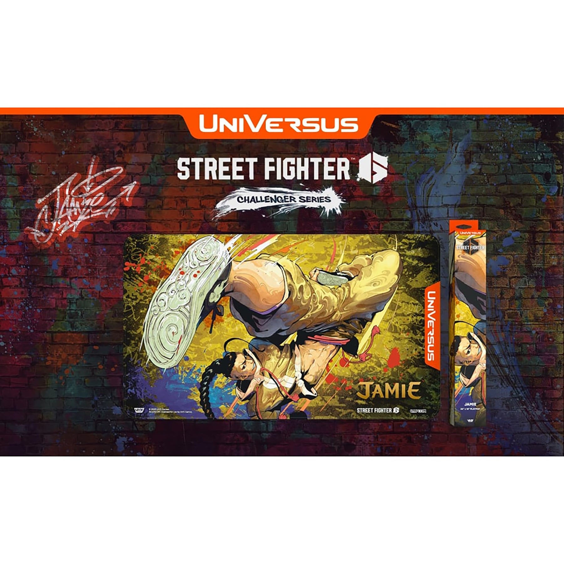 Step into the ring with the UniVersus: Street Fighter 6 Challenger Series Playmat featuring Jamie! This premium playmat is designed for fans of the UniVersus card game and Street Fighter 6, offering both functional gameplay support and stunning visual appeal. Perfect for casual matches or competitive play, it enhances your gaming experience with a durable, non-slip surface and vibrant character artwork.