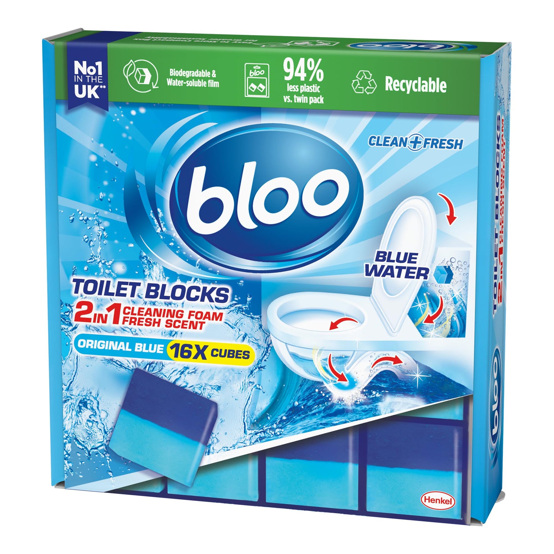 • Blue water technology that colours toilet water and releases cleaning foam with every flush