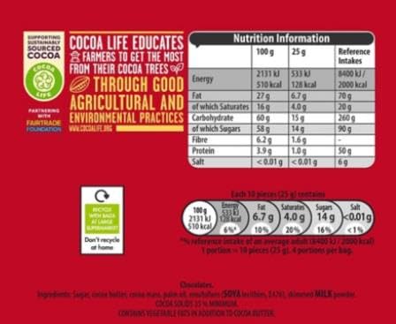 Sugar, Cocoa Butter, Cocoa Mass, Palm Oil, Emulsifiers (SOYA Lecithins, E476), Skimmed MILK Powder. Cocoa Solids 35% Minimum. Contains Vegetable Fats In Addition To Cocoa Butter.