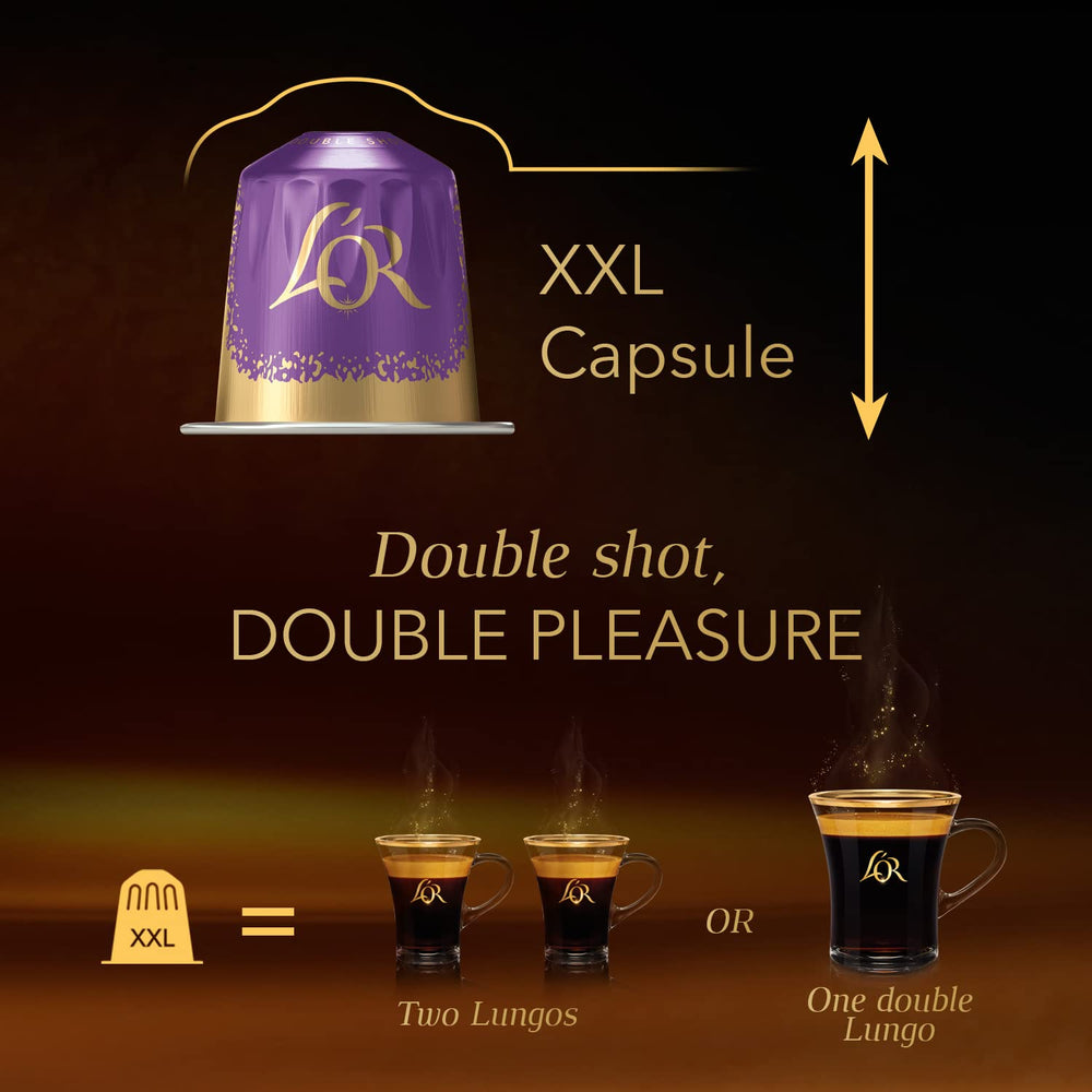 Each pack contains 50 (5 x 10) L'OR BARISTA Double Lungo Profondo XXL capsules with an intensity level of 8, crafted from infinitely recyclable aluminium and made with responsibly sourced coffee for a sustainable coffee experience.