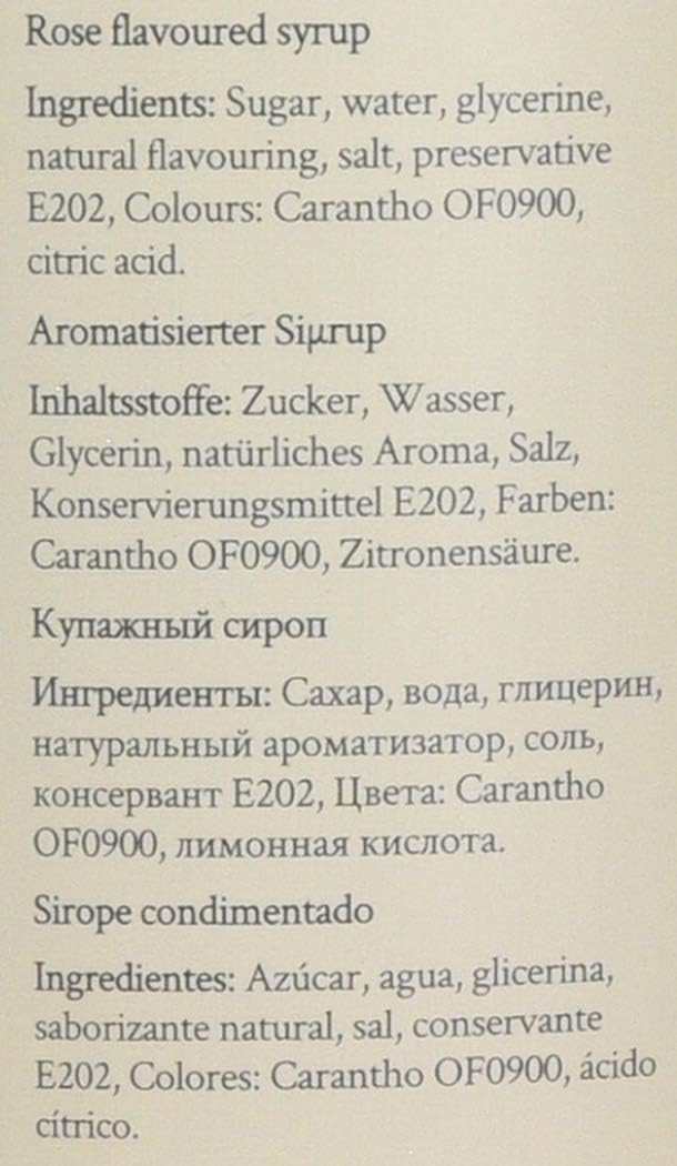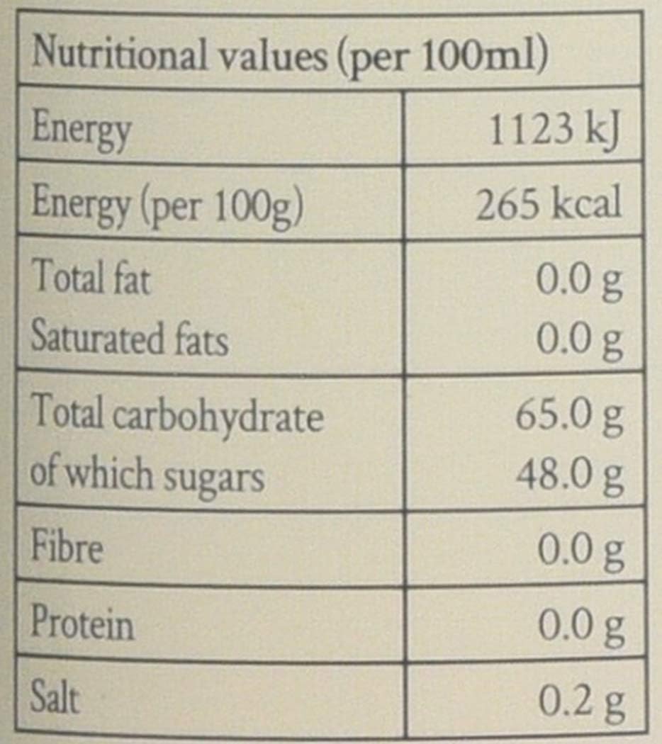 • Ingredients: Sugar, Water, Glycerine, Natural flavouring, Salt, Preservative E202, Colours: Carantho OF0900, Citric acid