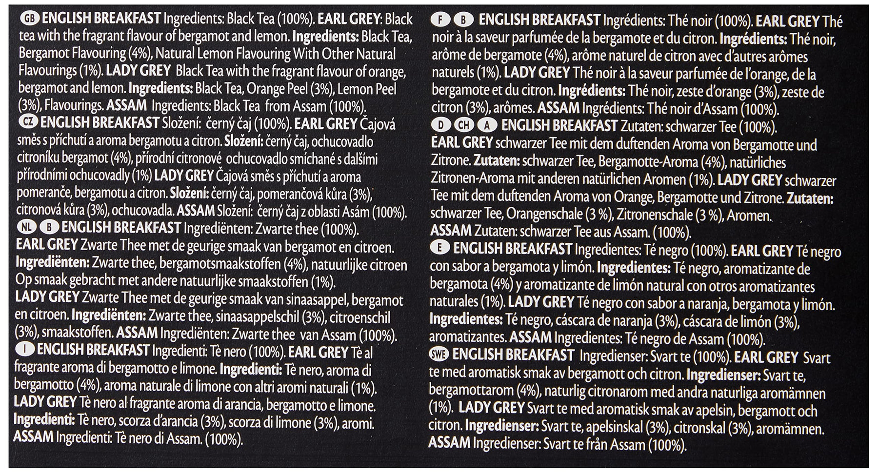 • Ingredients: Black tea (100%) for English Breakfast and Assam; natural flavourings and citrus peels for Earl Grey and Lady Grey
