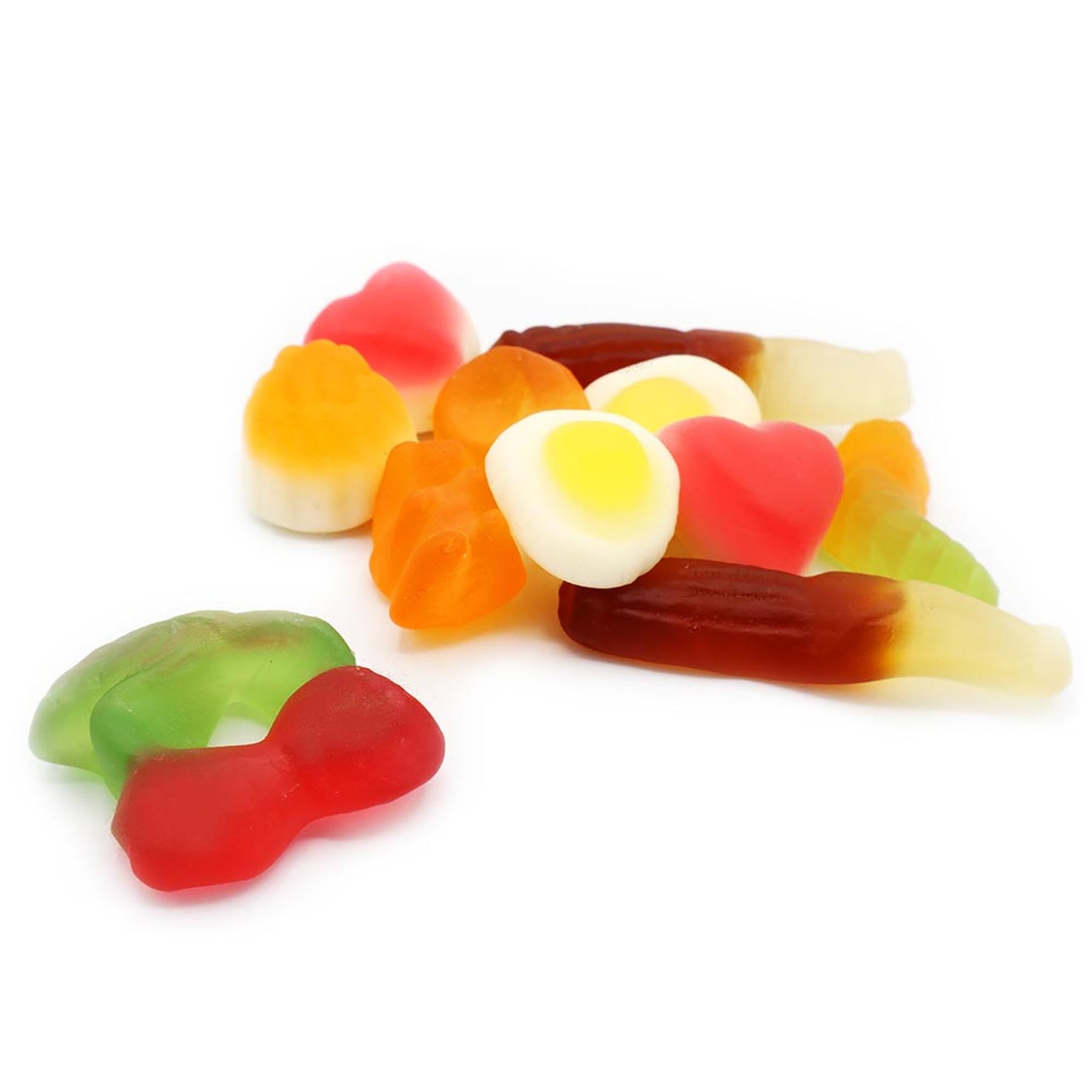 - Traditional pick 'n' mix selection: cherries, eggs, and cola bottles