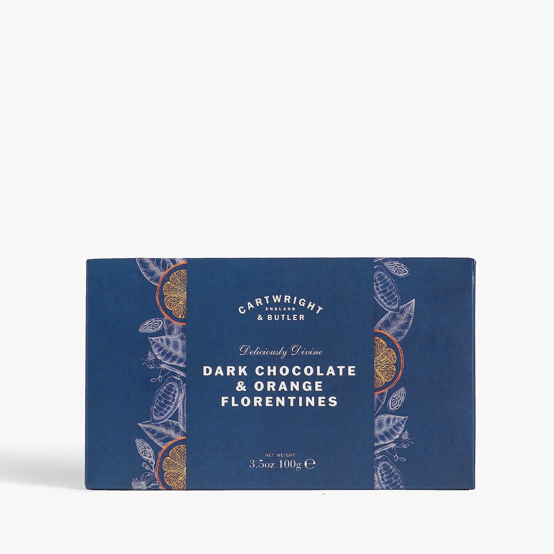 Indulge in the luxurious taste of Cartwright & Butler's Dark Chocolate & Orange Florentines, a gourmet treat crafted for discerning palates. These rich, artisan-style biscuits blend sweet candied orange, plump raisins, and crunchy almonds, all bound with honey and cream, then generously coated in thick dark chocolate with a minimum of 62% cocoa solids.