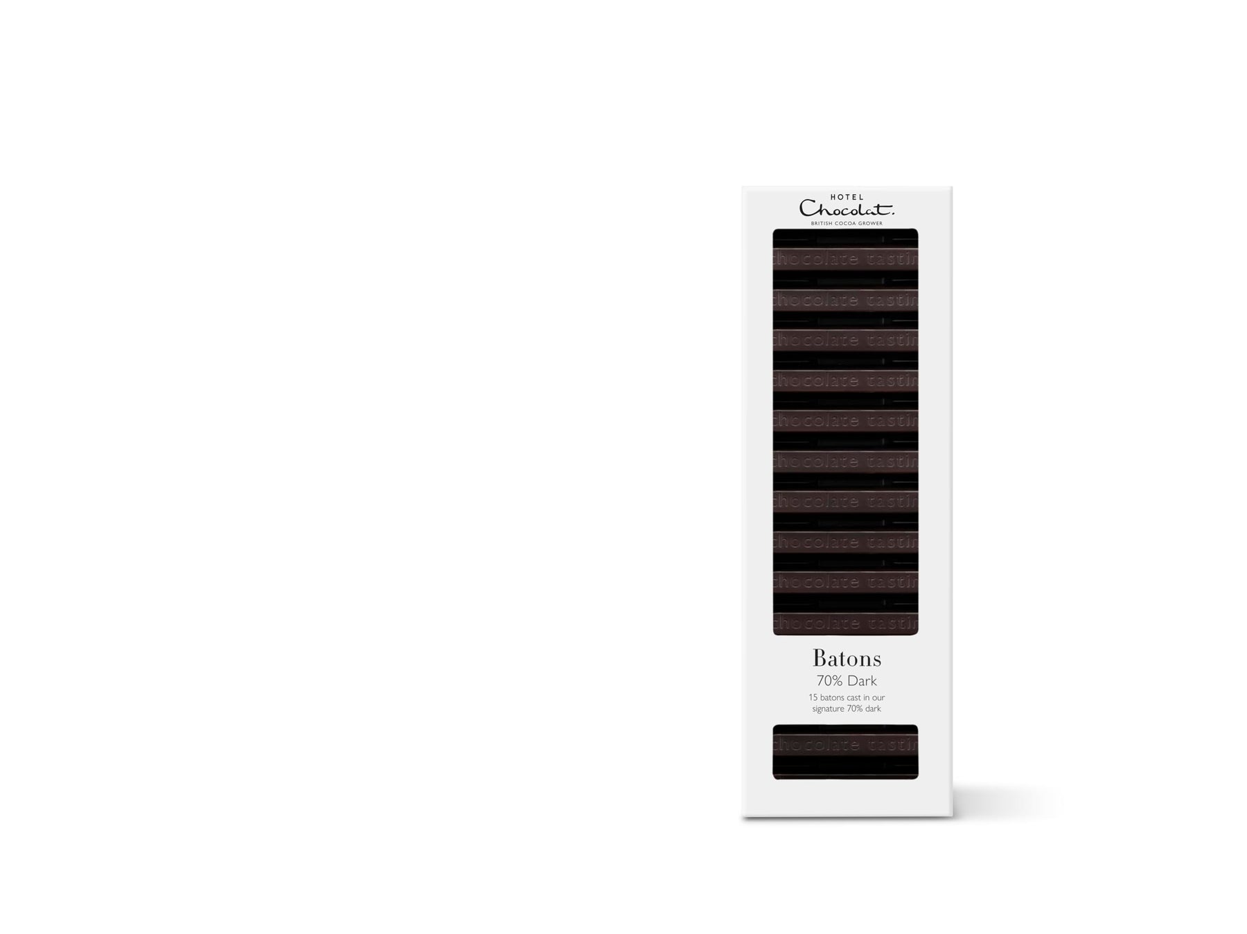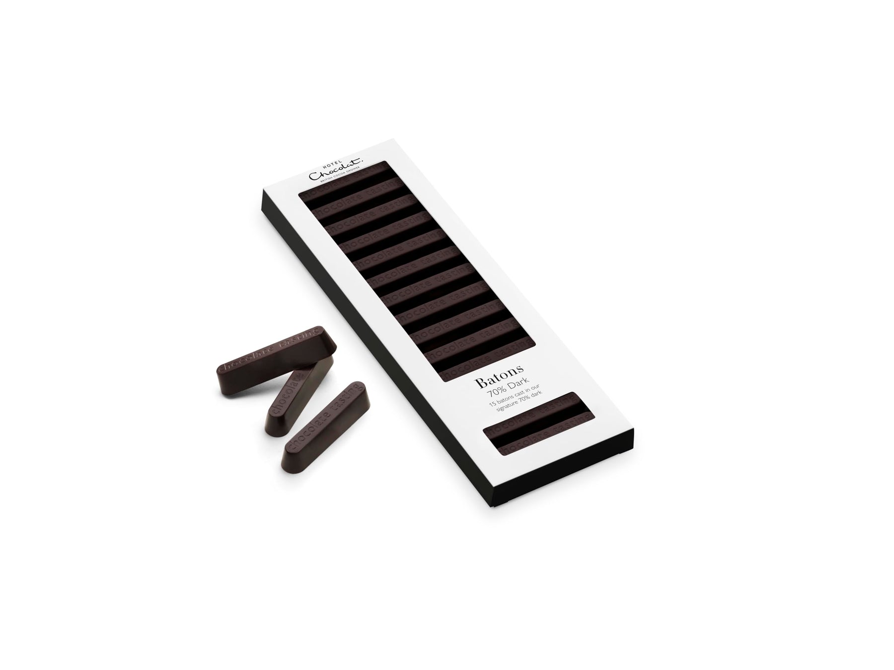 Elegant and sophisticated, Hotel Chocolat's 70% Dark Chocolate Batons offer a refined chocolate experience crafted for lovers of intense dark chocolate. Each of the 15 solid batons is made with a high cacao content, delivering deep, decadent flavor without bitterness. Designed to be savored slowly, they feature a satisfying "snap" and melt gradually, making them a perfect companion to your favorite hot drink.