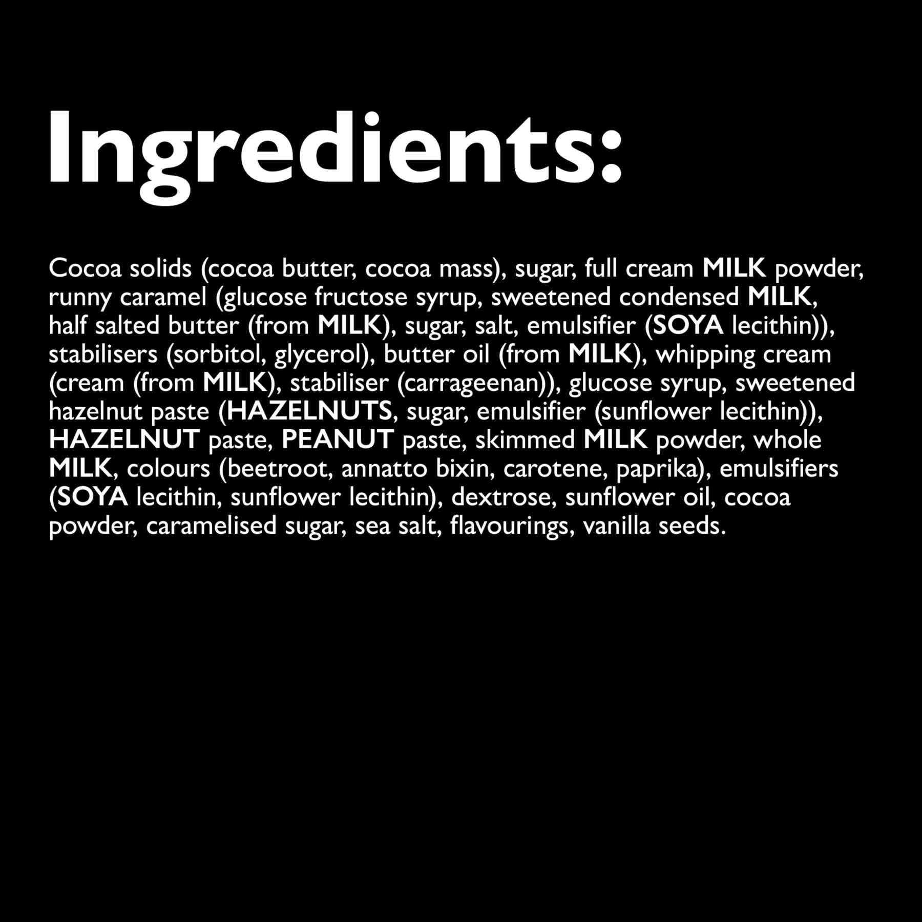 Ingredients: cocoa solids (cocoa butter, cocoa mass), sugar, full cream MILK powder, runny caramel (glucose fructose syrup, sweetened condensed MILK, half salted butter (from MILK), sugar, salt, emulsifier (SOYA lecithin)), stabilisers (sorbitol, glycerol), butter oil (from MILK), whipping cream (cream (from MILK), stabiliser (carrageenan)), glucose syrup, sweetened hazelnut paste (HAZELNUTS, sugar, emulsifier (sunflower lecithin)), HAZELNUT paste, PEANUT paste, skimmed MILK powder, whole MILK, natural colours (beetroot, annatto bixin, carotene, paprika), emulsifiers (SOYA lecithin, sunflower lecithin), dextrose, sunflower oil, cocoa powder, caramelised sugar, sea salt, flavourings, vanilla seeds. Milk chocolate contains minimum 40% cocoa solids, minimum 20% milk solids. White chocolate contains minimum 36% cocoa butter, minimum 27% milk solids. For allergens, including cereals containing gluten, see ingredients in BOLD.