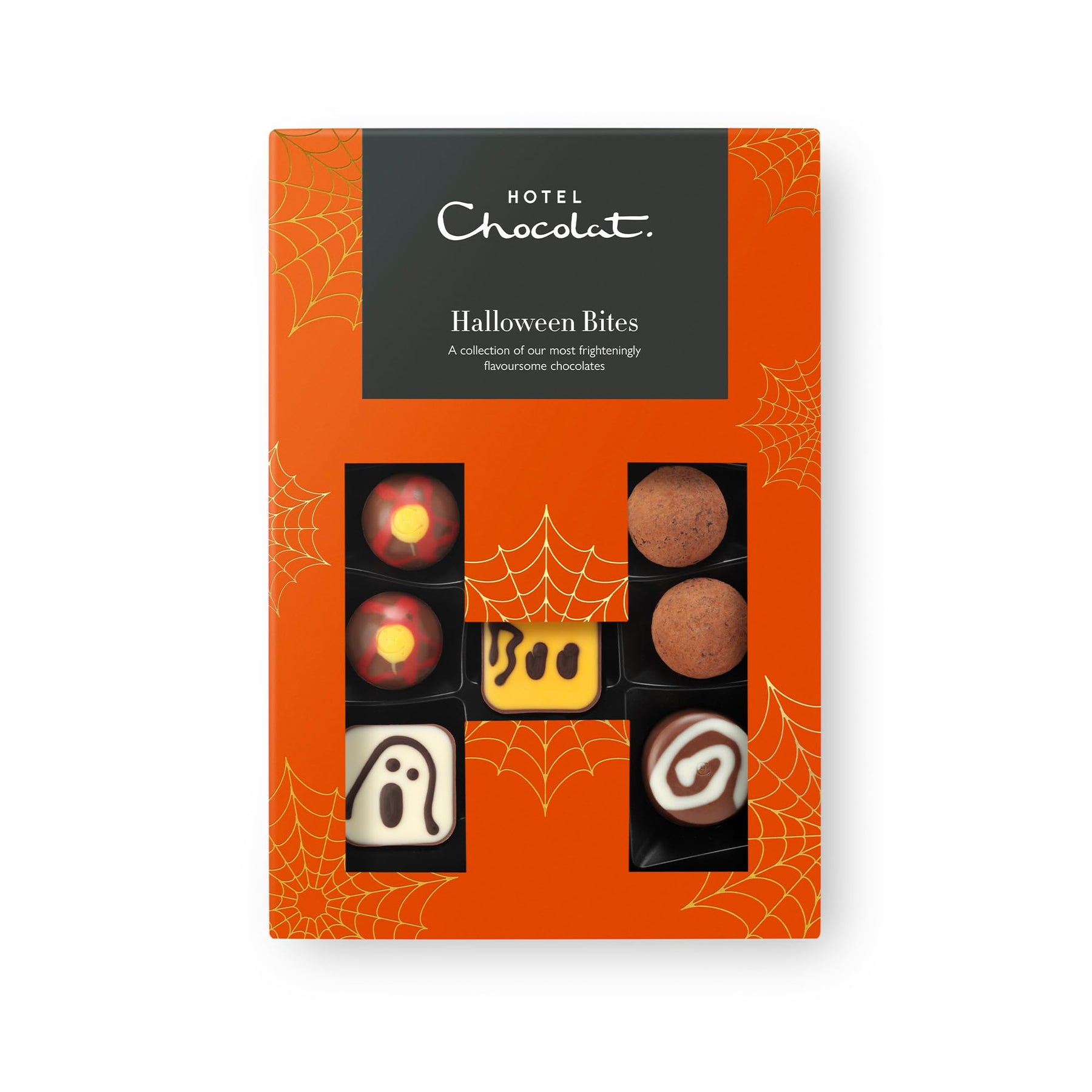 A family-friendly selection of 14 Halloween chocolates from Hotel Chocolat, perfect for sharing during a spooky movie night or gifting to Halloween enthusiasts. This collection features a mix of filled and solid chocolates in milk, white, dark, and caramel-milk varieties, including limited-edition spooky recipes crafted without alcohol.