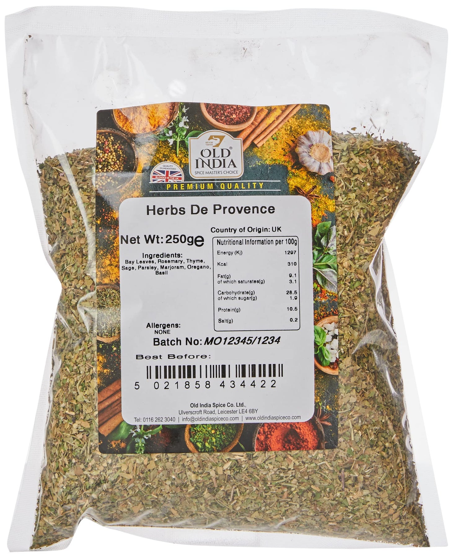 Old India Herbs de Provence is a premium blend of natural herbs, expertly mixed to enhance the flavor of a wide variety of dishes. This 250g pack contains a 100% natural, additive-free, and GMO-free blend that can be added to curries, vegetable dishes, sauces, soups, stews, and much more.
